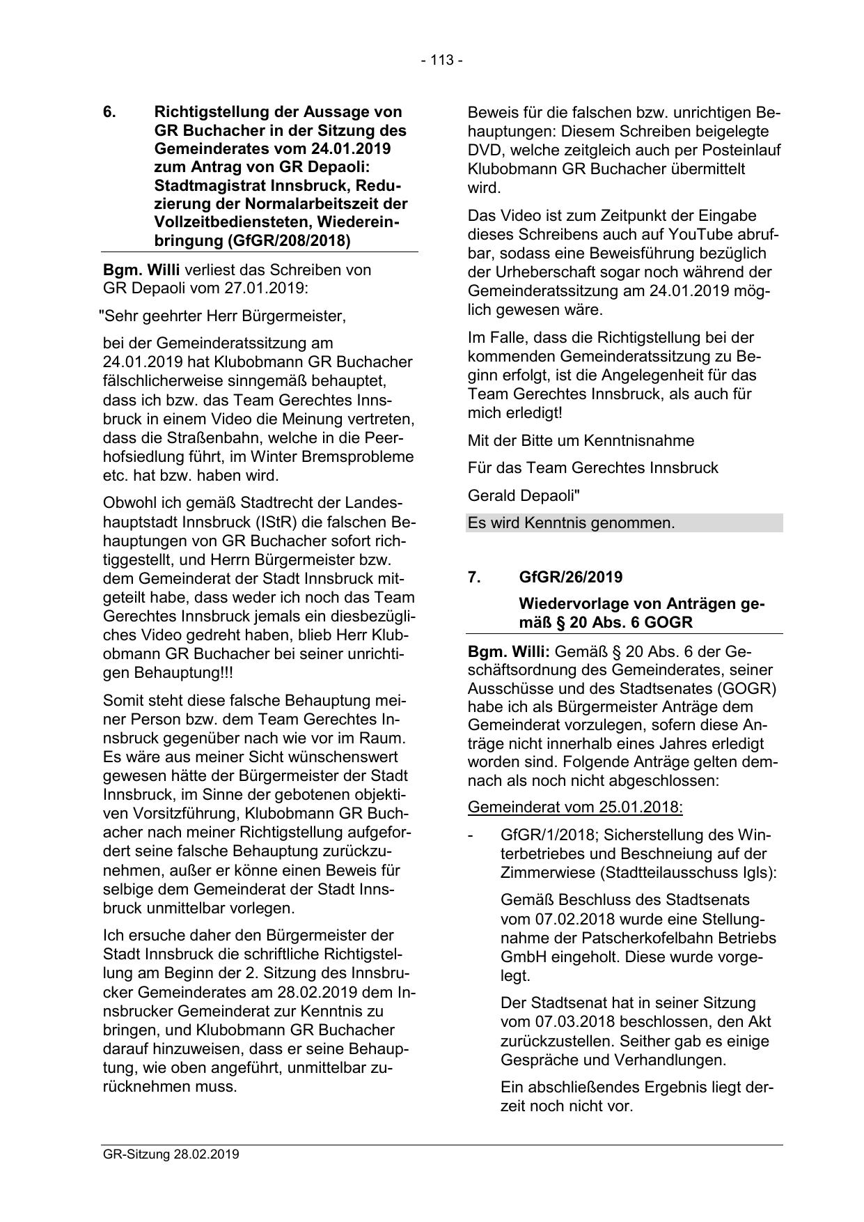 Stadt Innsbruck die schriftliche Richtigstellung am Beginn der 2. Sitzung des Innsbrucker Gemeinderates am 28.02.2019 dem Innsbrucker Gemeinderat zur Kenntnis zu