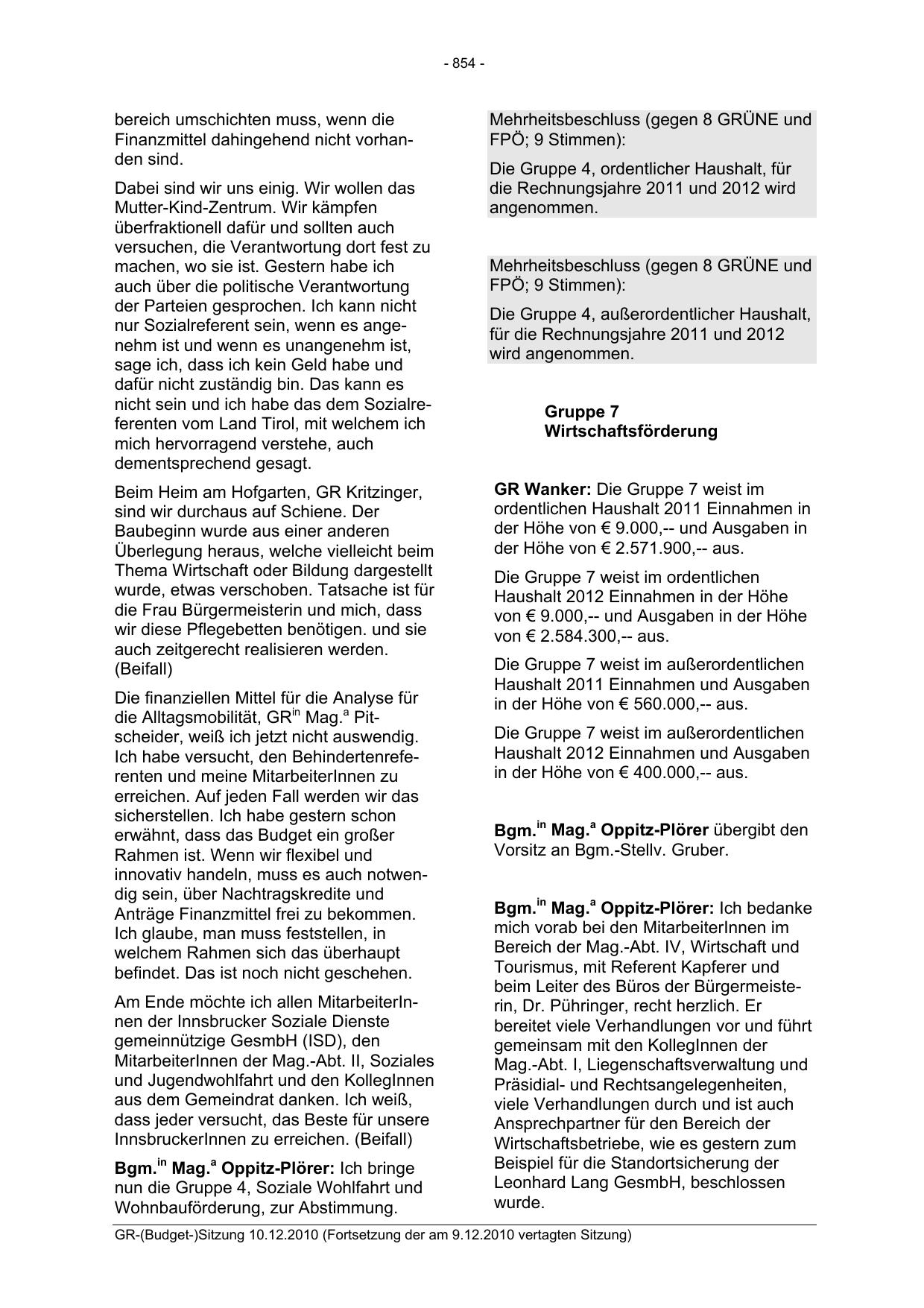GR-(Budget-)Sitzung 10.12.2010 (Fortsetzung der am 9.12.2010 vertagten Sitzung)