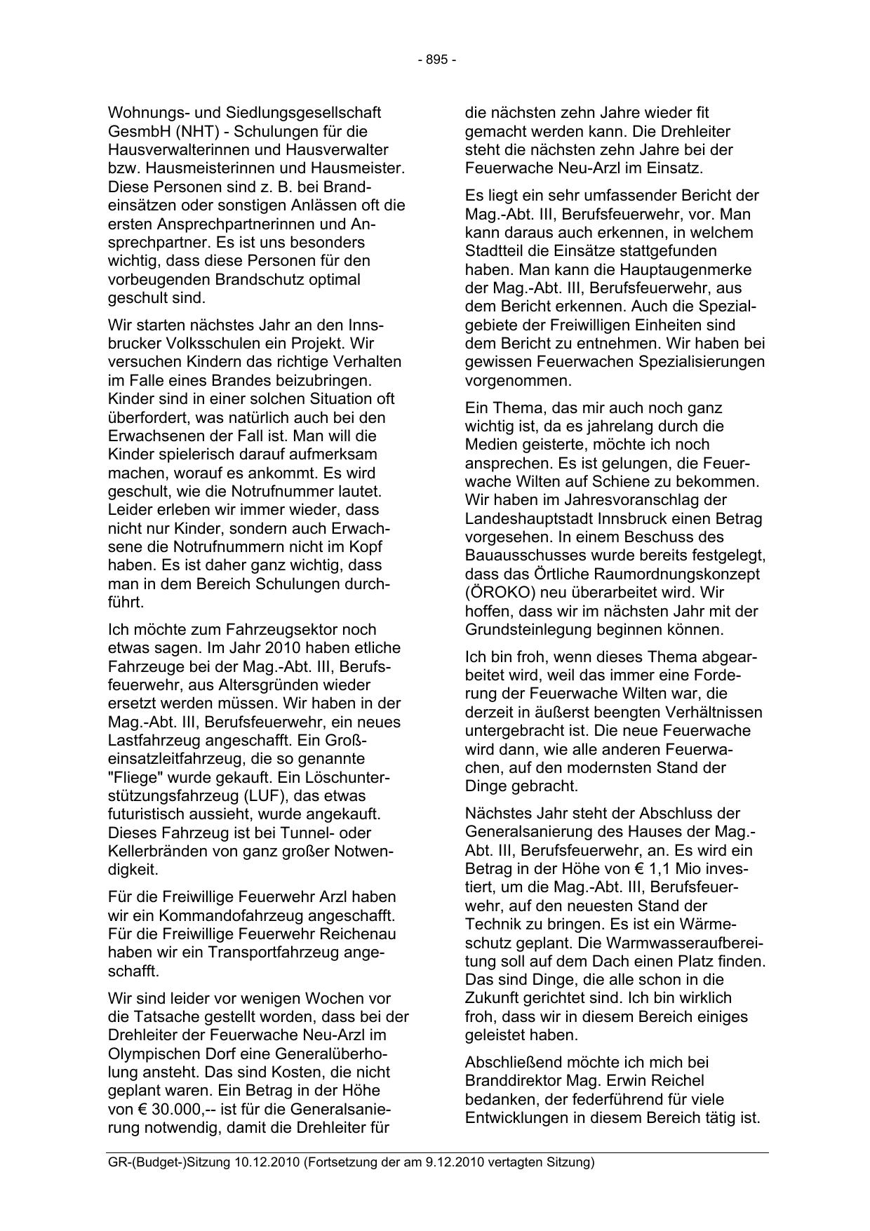 GR-(Budget-)Sitzung 10.12.2010 (Fortsetzung der am 9.12.2010 vertagten Sitzung)