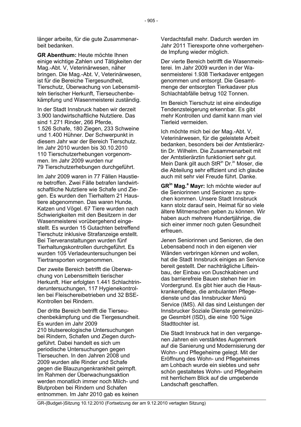 GR-(Budget-)Sitzung 10.12.2010 (Fortsetzung der am 9.12.2010 vertagten Sitzung)
