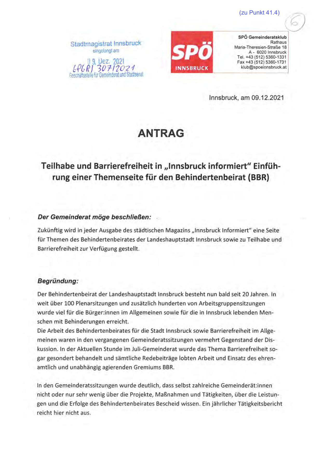 Teilhabe und Barrierefreiheit in „Innsbruck informiert" Einführung einer Themenseite für den Behindertenbeirat (BBR)