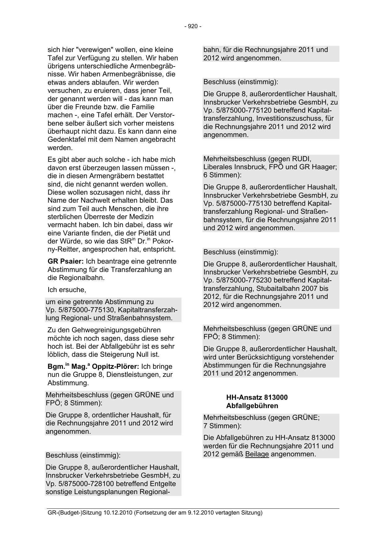 sonstige Leistungsplanungen RegionalGR-(Budget-)Sitzung 10.12.2010 (Fortsetzung der am 9.12.2010 vertagten Sitzung)
