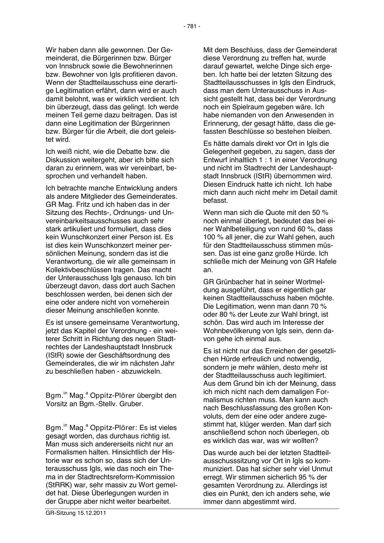 Formalismen halten. Hinsichtlich der Historie war es schon so, dass sich der Unterausschuss Igls, wie das noch ein Thema in der Stadtrechtsreform-Kommission