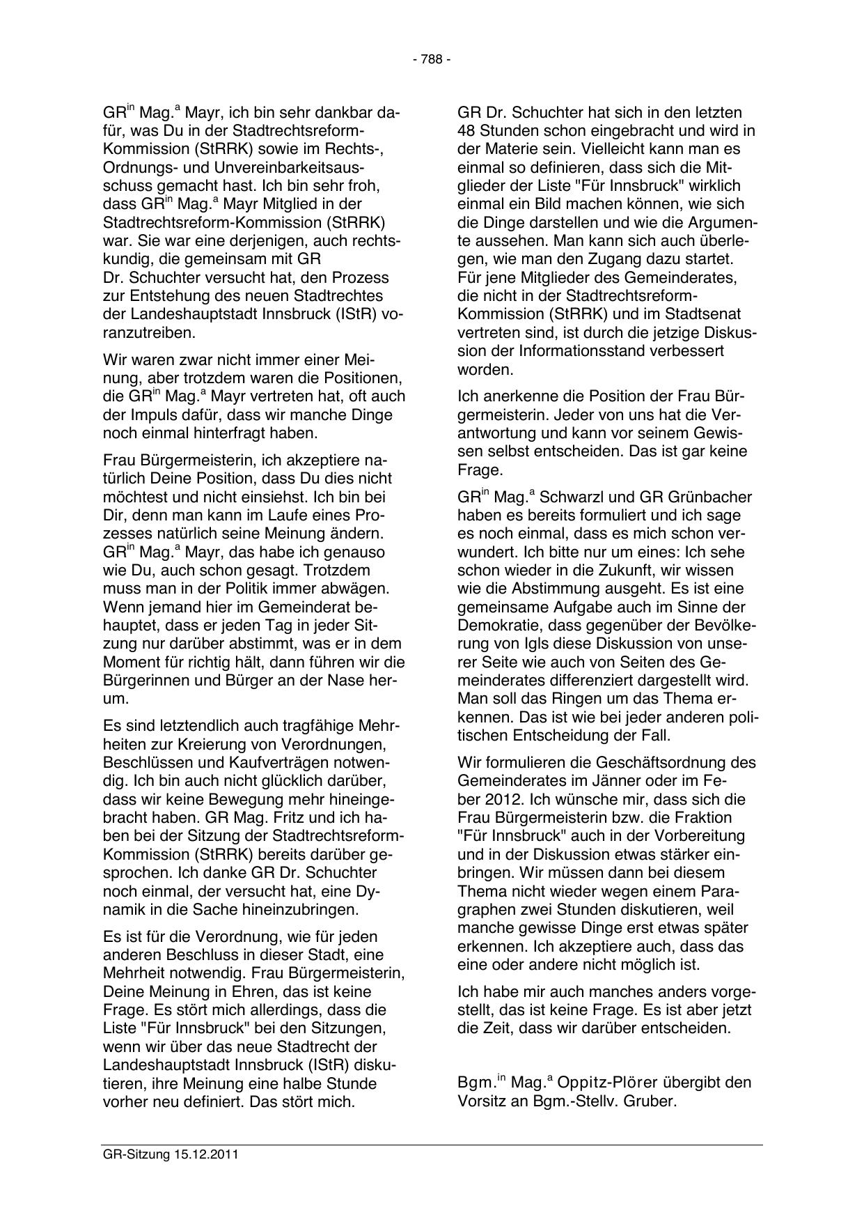 dass wir keine Bewegung mehr hineingebracht haben. GR Mag. Fritz und ich haben bei der Sitzung der StadtrechtsreformKommission (StRRK) bereits darüber gesprochen. Ich danke GR Dr. Schuchter
