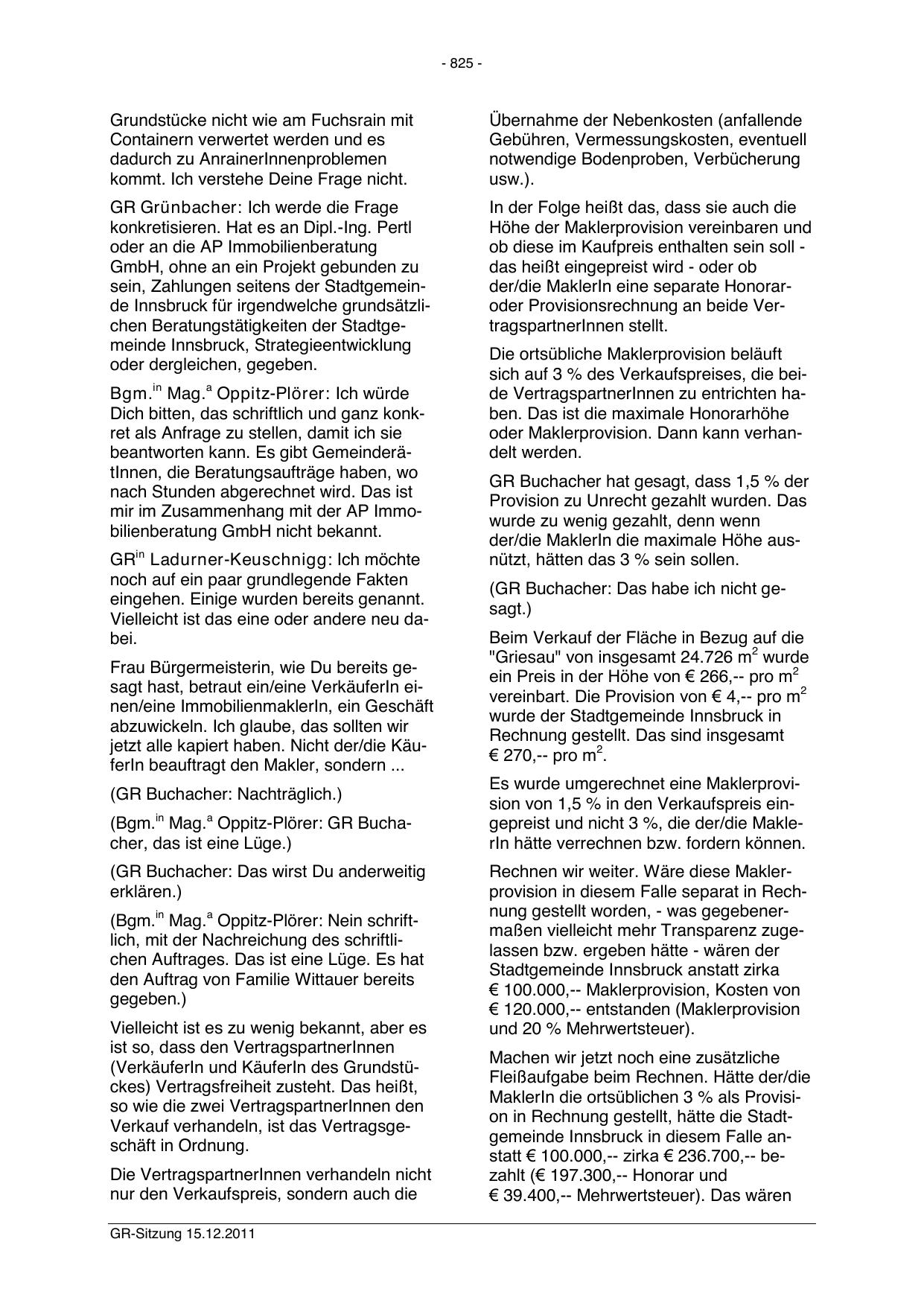 MaklerIn die ortsüblichen 3 % als Provision in Rechnung gestellt, hätte die Stadtgemeinde Innsbruck in diesem Falle anstatt € 100.000,-- zirka € 236.700,-- bezahlt (€ 197.300,-- Honorar und