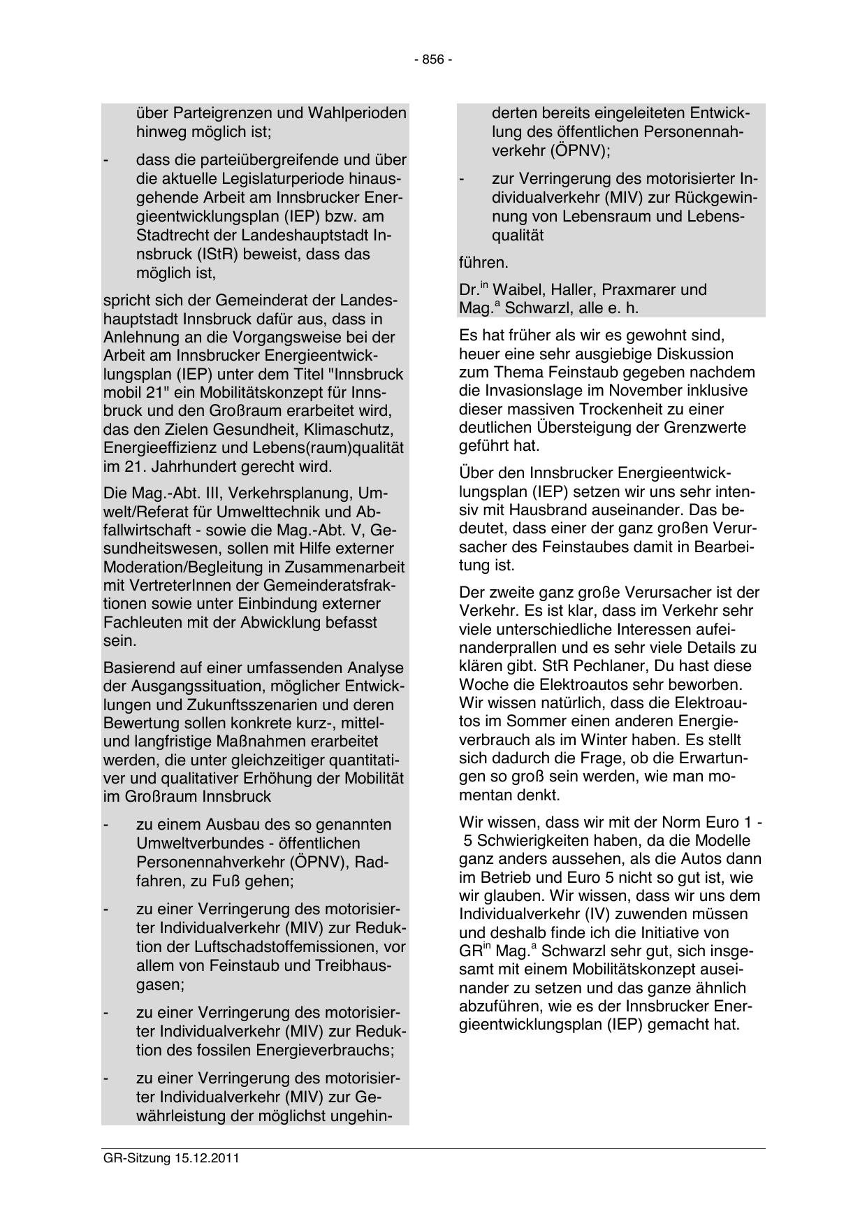 Über den Innsbrucker Energieentwicklungsplan (IEP) setzen wir uns sehr intensiv mit Hausbrand auseinander. Das bedeutet, dass einer der ganz großen Verursacher des Feinstaubes damit in Bearbeitung ist.