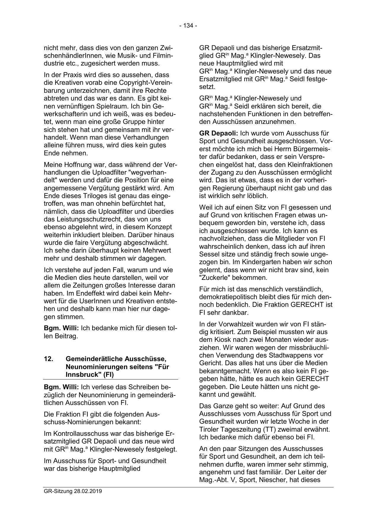Bgm. Willi: Ich verlese das Schreiben bezüglich der Neunominierung in gemeinderätlichen Ausschüssen von FI.