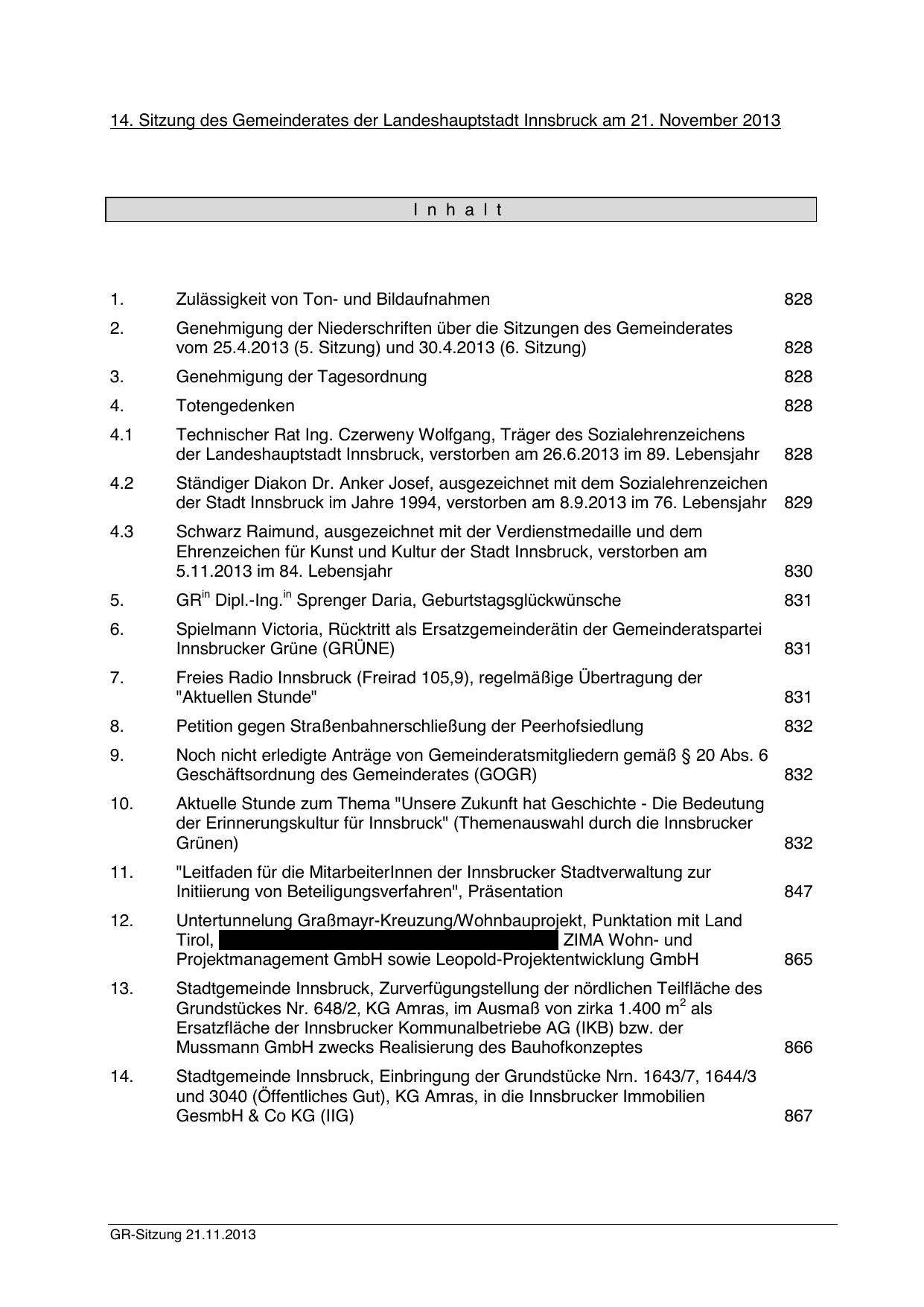 14. Sitzung des Gemeinderates der Landeshauptstadt Innsbruck am 21. November 2013