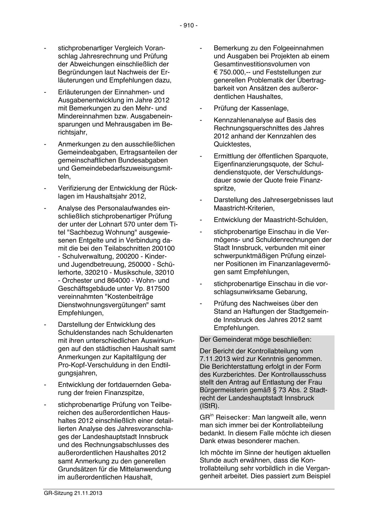 stichprobenartige Prüfung von Teilbereichen des außerordentlichen Haushaltes 2012 einschließlich einer detaillierten Analyse des Jahresvoranschlages der Landeshauptstadt Innsbruck