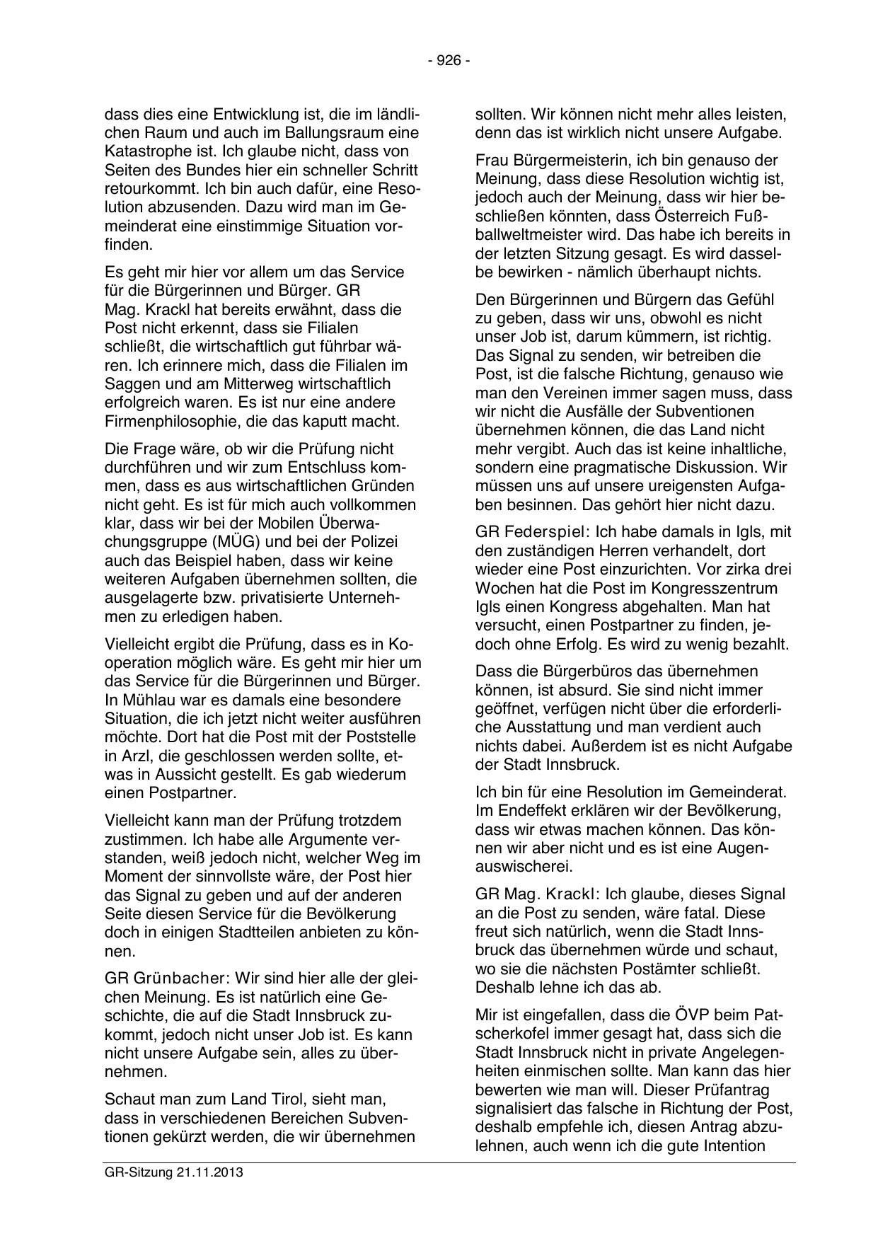 GR Grünbacher: Wir sind hier alle der gleichen Meinung. Es ist natürlich eine Geschichte, die auf die Stadt Innsbruck zukommt, jedoch nicht unser Job ist. Es kann