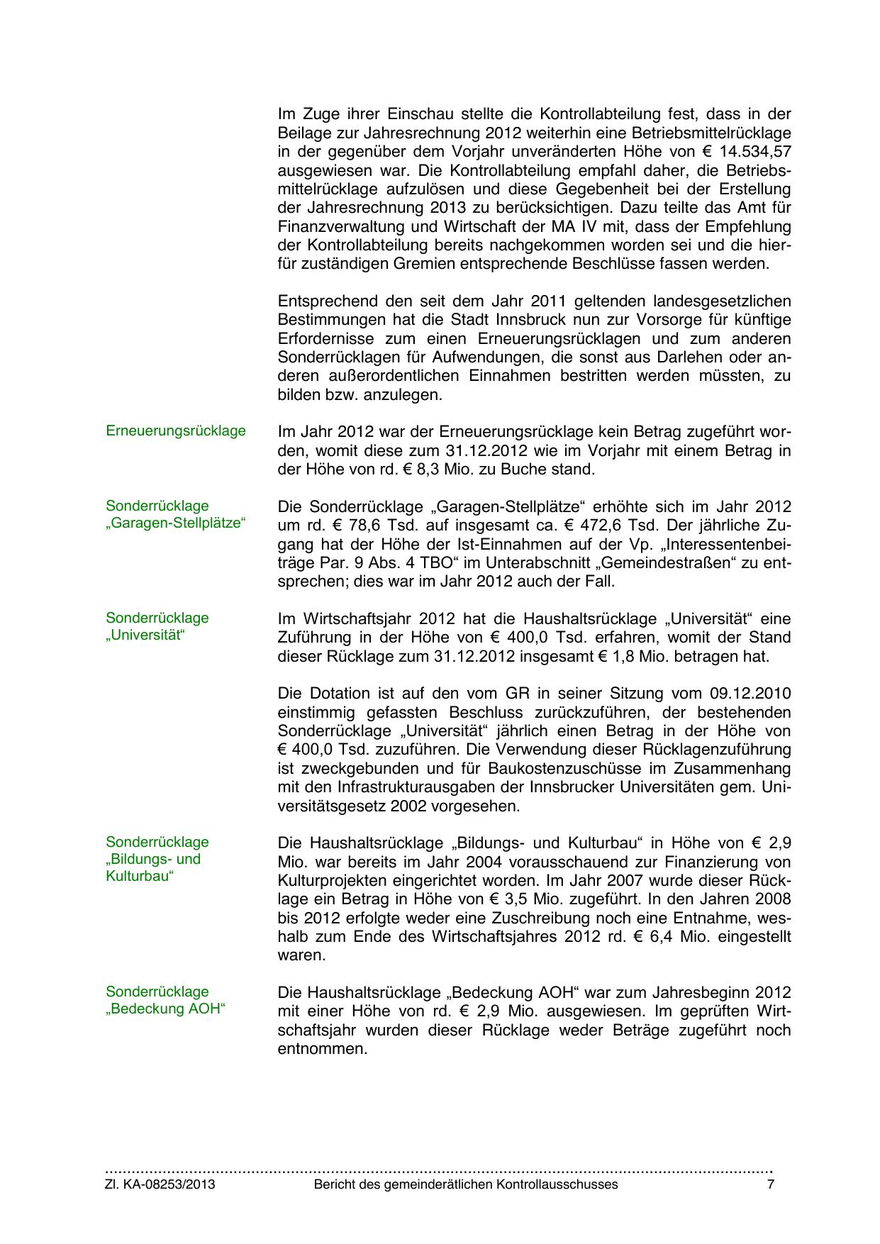 Beilage zur Jahresrechnung 2012 weiterhin eine Betriebsmittelrücklage