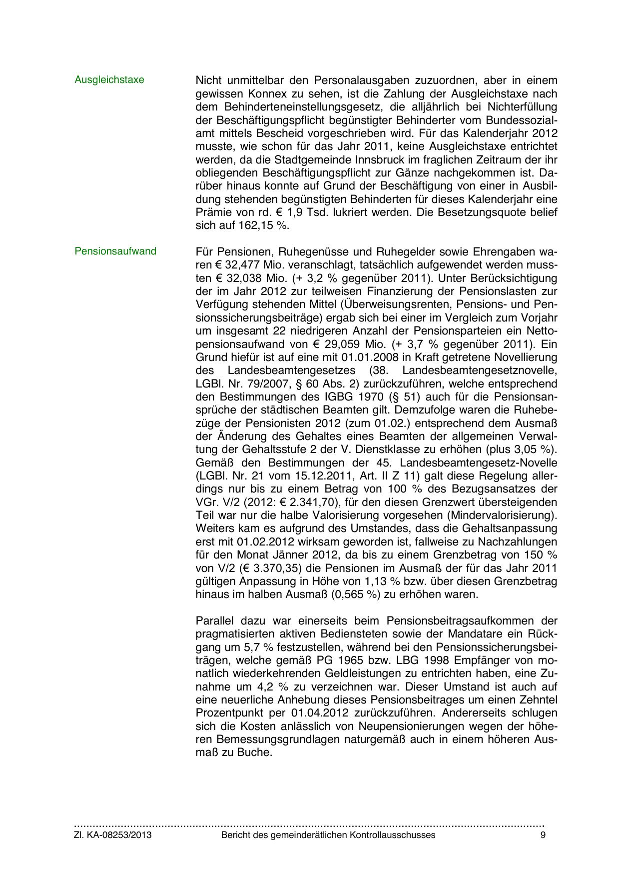 Für Pensionen, Ruhegenüsse und Ruhegelder sowie Ehrengaben waren € 32,477 Mio. veranschlagt, tatsächlich aufgewendet werden mussten € 32,038 Mio. (+ 3,2 % gegenüber 2011). Unter Berücksichtigung