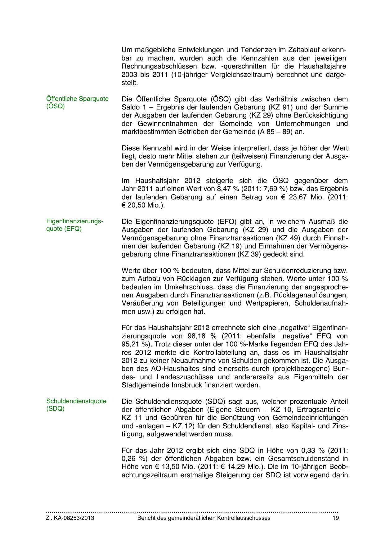 Für das Haushaltsjahr 2012 errechnete sich eine „negative“ Eigenfinanzierungsquote von 98,18 % (2011: ebenfalls „negative“ EFQ von