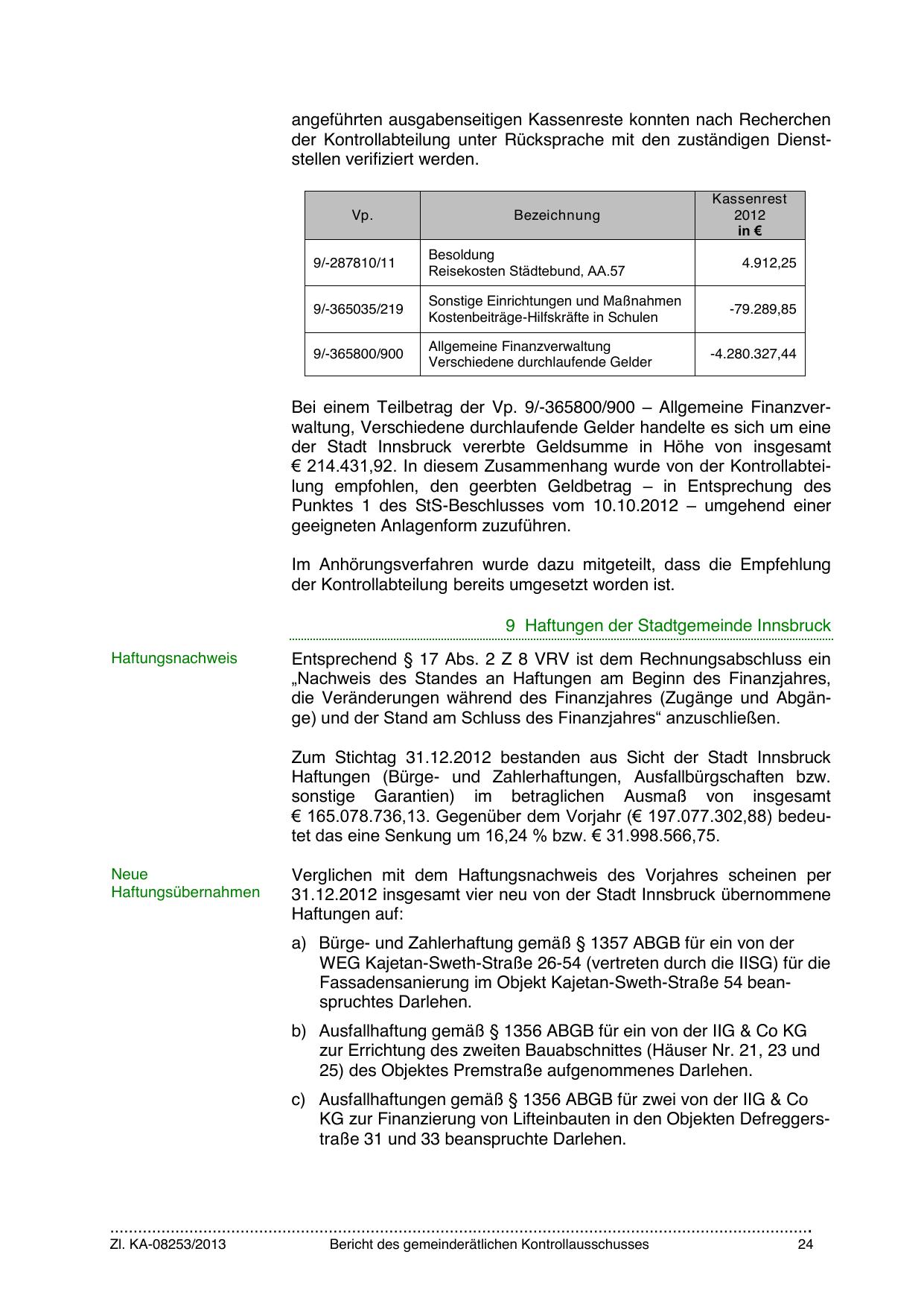 Zum Stichtag 31.12.2012 bestanden aus Sicht der Stadt Innsbruck