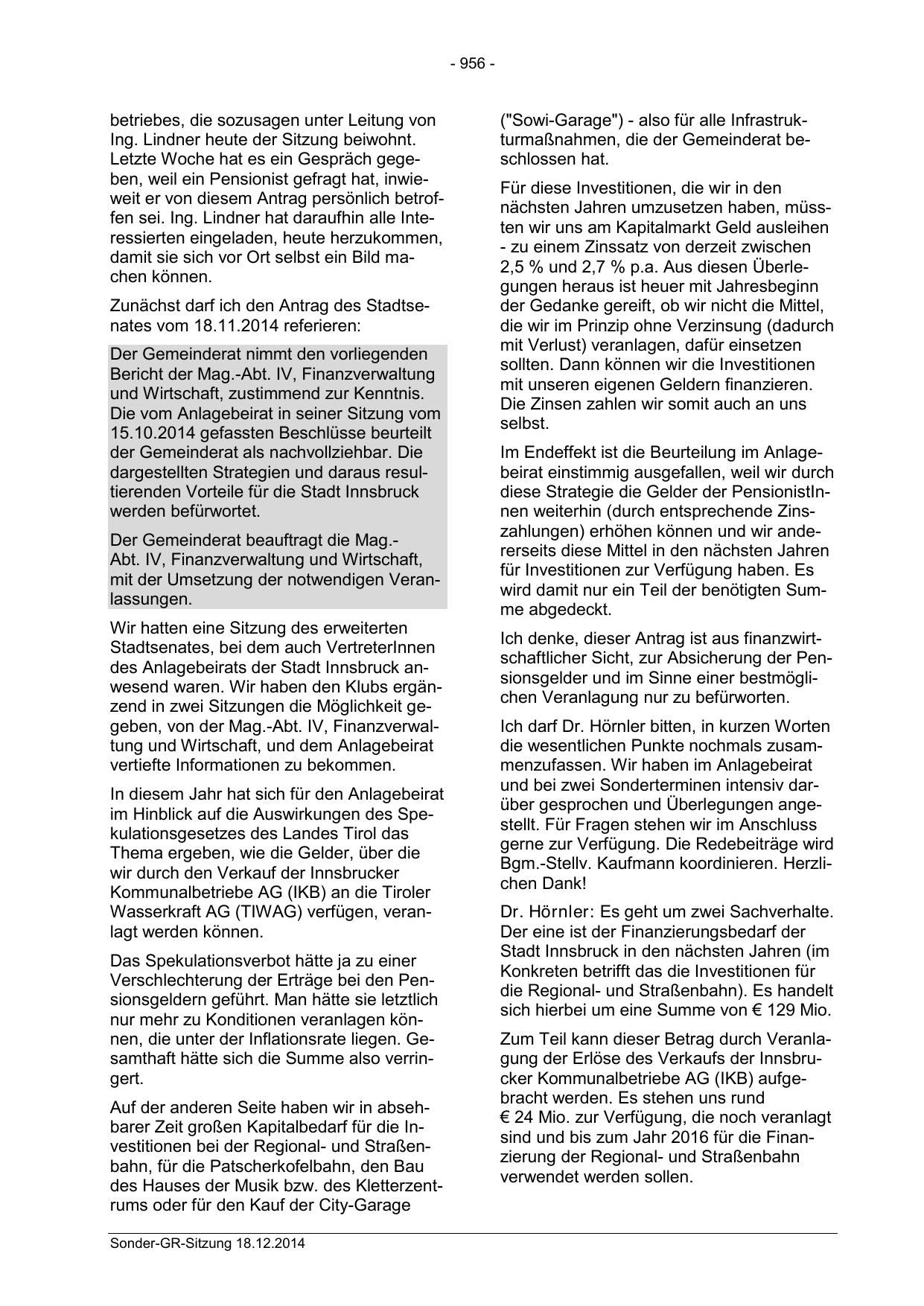 des Anlagebeirats der Stadt Innsbruck anwesend waren. Wir haben den Klubs ergänzend in zwei Sitzungen die Möglichkeit gegeben, von der Mag.-Abt. IV, Finanzverwaltung und Wirtschaft, und dem Anlagebeirat