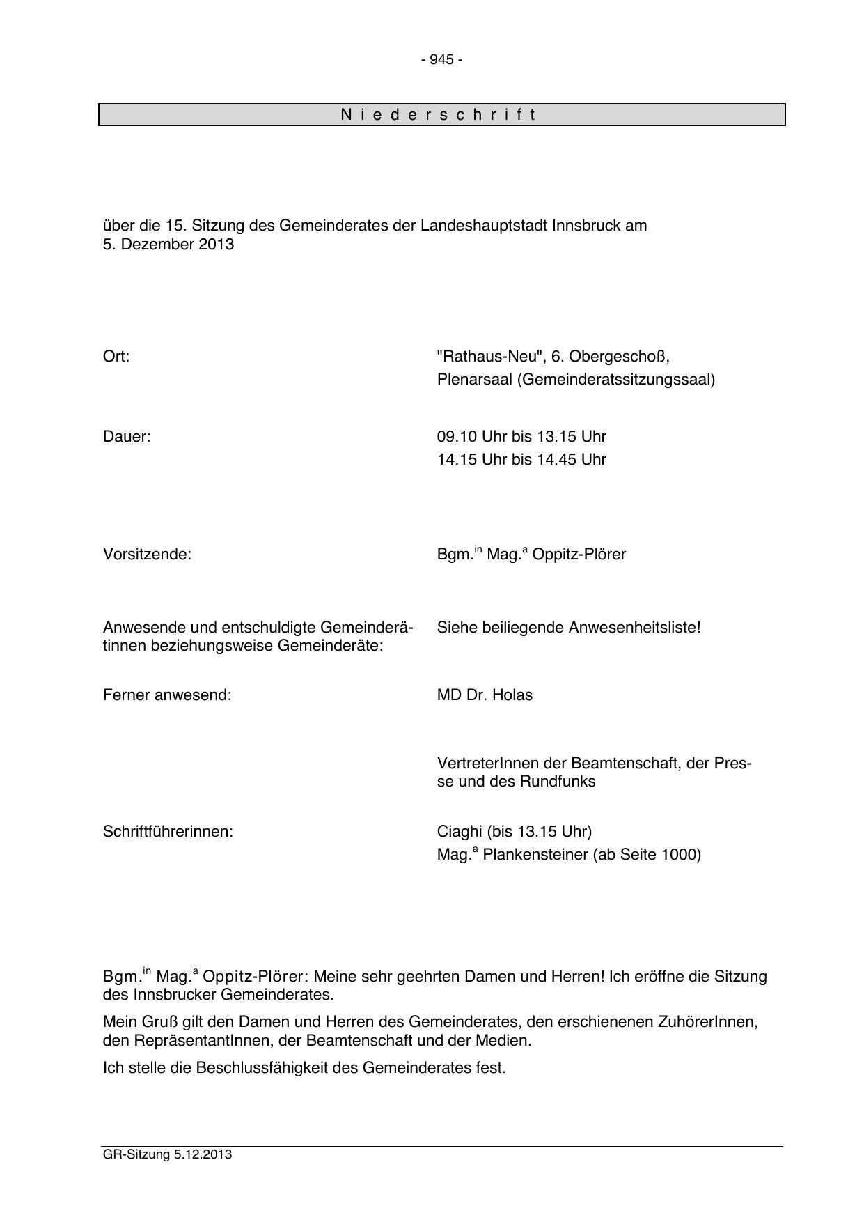 Bgm.in Mag.a Oppitz-Plörer: Meine sehr geehrten Damen und Herren! Ich eröffne die Sitzung
