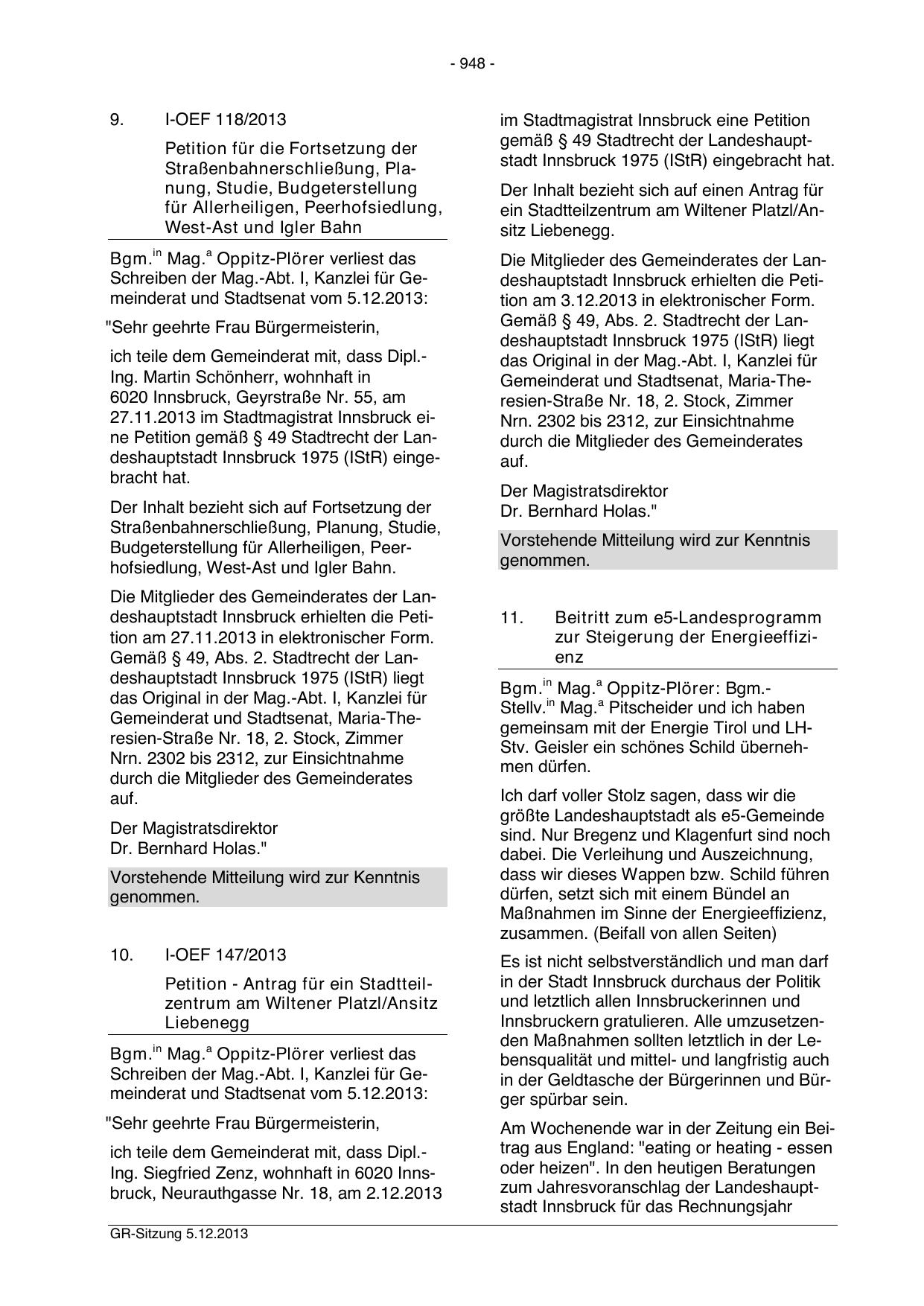 ich teile dem Gemeinderat mit, dass Dipl.Ing. Siegfried Zenz, wohnhaft in 6020 Innsbruck, Neurauthgasse Nr. 18, am 2.12.2013