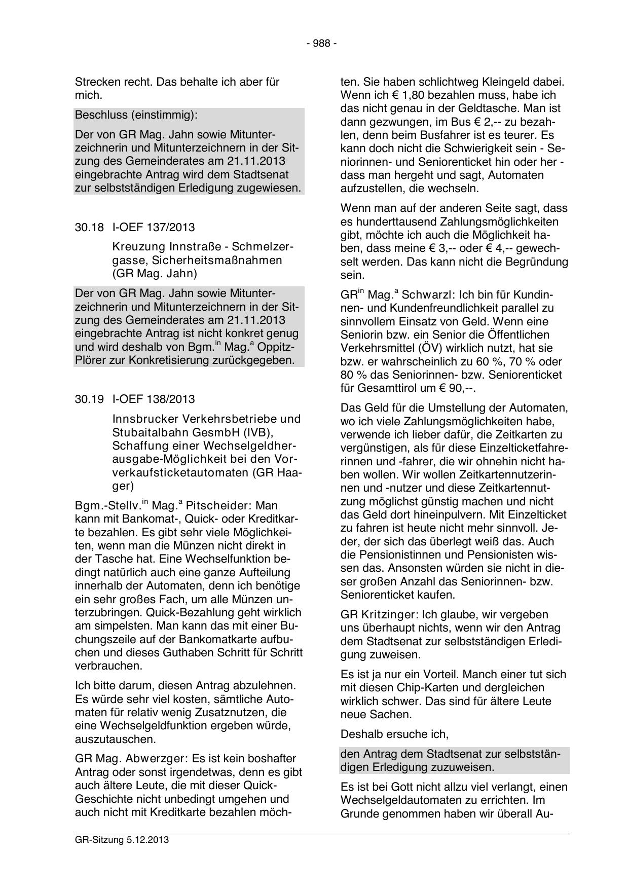 auch nicht mit Kreditkarte bezahlen möchGR-Sitzung 5.12.2013