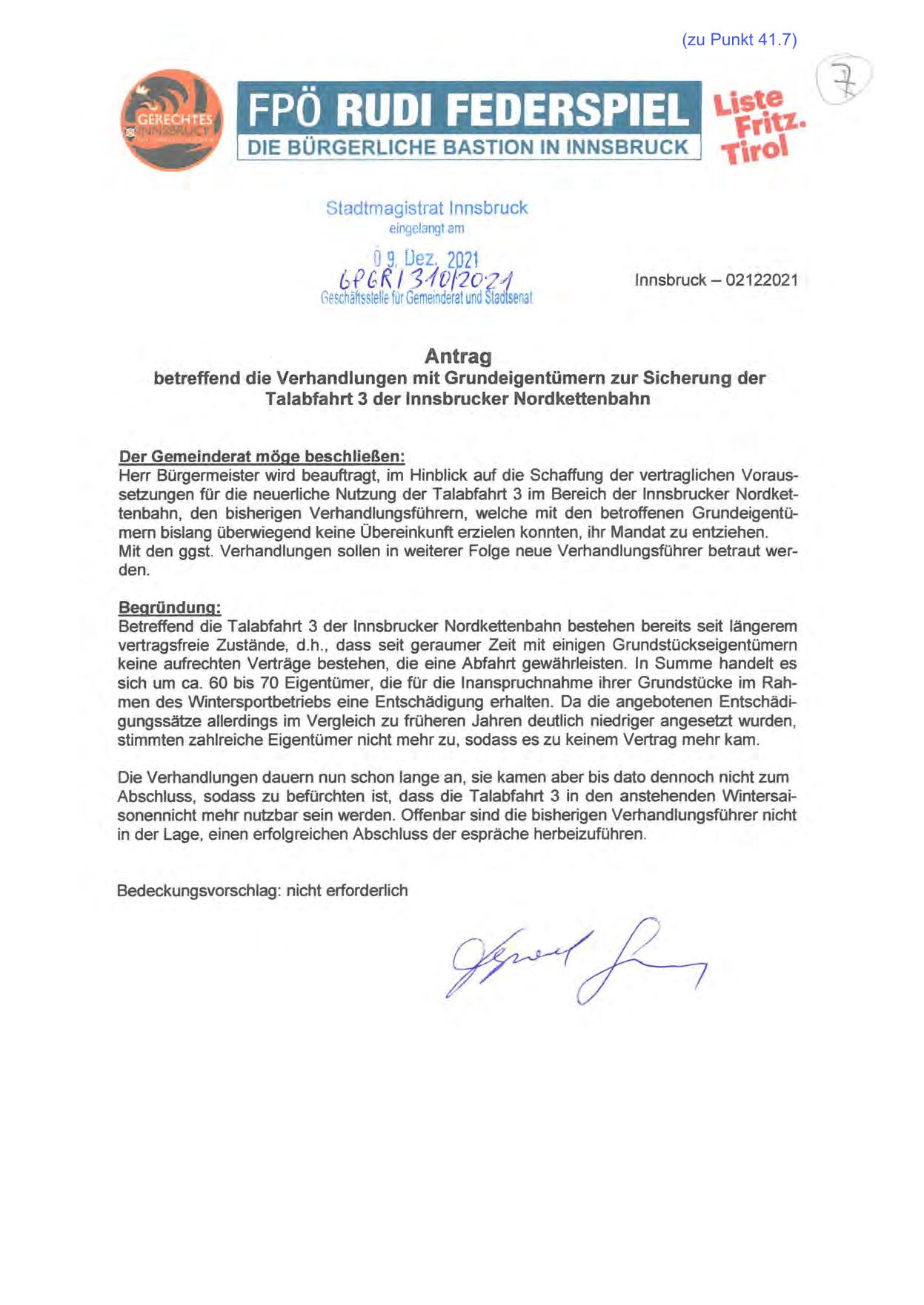 Herr Bürgermeister wird beauftragt, im Hinblick auf die Schaffung der vertraglichen Voraussetzungen für die neuerliche Nutzung der Talabfahrt 3 im Bereich der lnnsbrucker Nordkettenbahn, den bisherigen Verhandlungsführern, welche mit den betroffenen Grundeigentümern bislang überwiegend keine Übereinkunft erzielen konnten, ihr Mandat zu entziehen.