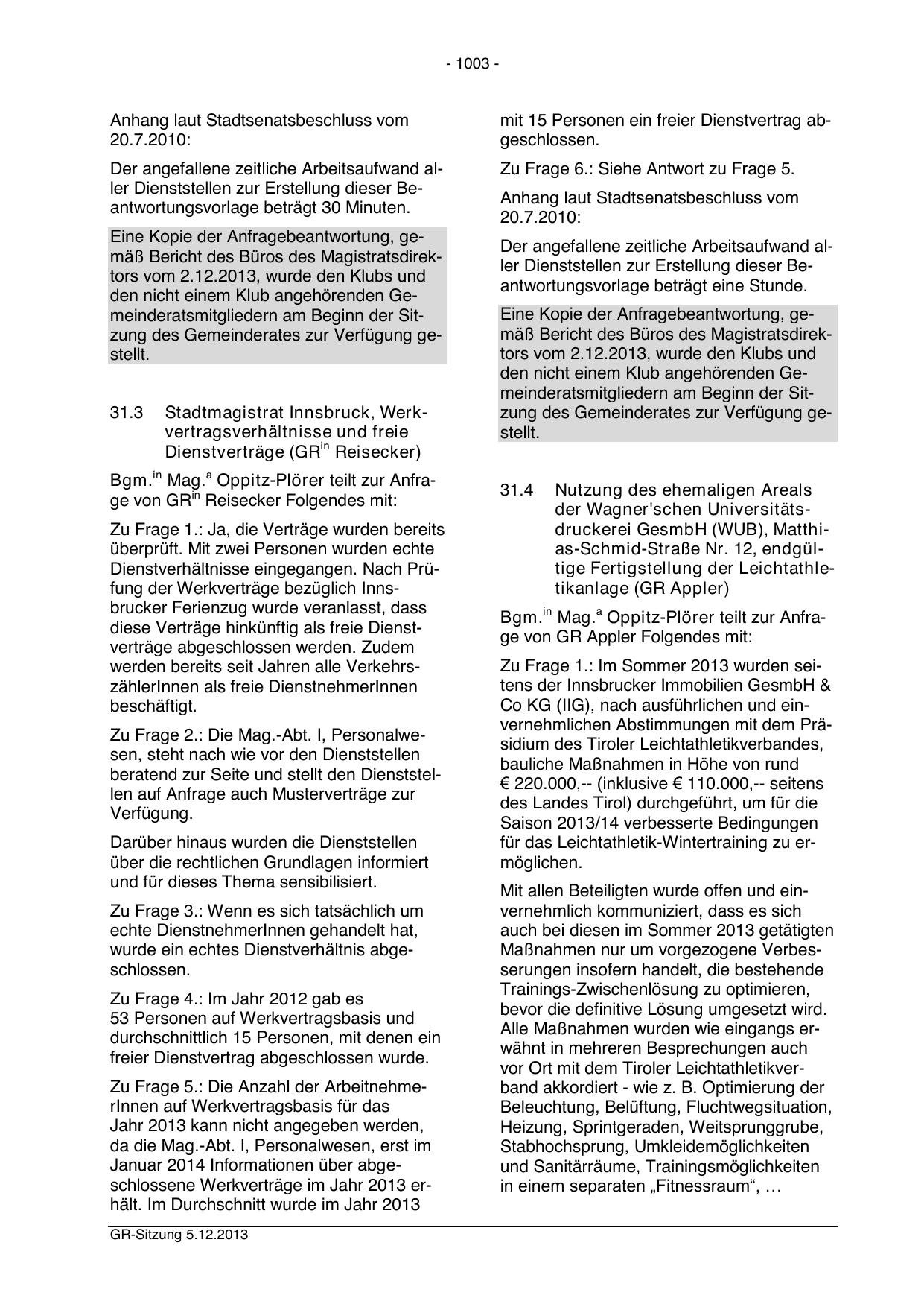 Eine Kopie der Anfragebeantwortung, gemäß Bericht des Büros des Magistratsdirektors vom 2.12.2013, wurde den Klubs und