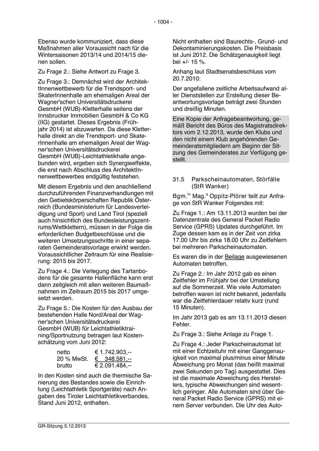 Eine Kopie der Anfragebeantwortung, gemäß Bericht des Büros des Magistratsdirektors vom 2.12.2013, wurde den Klubs und