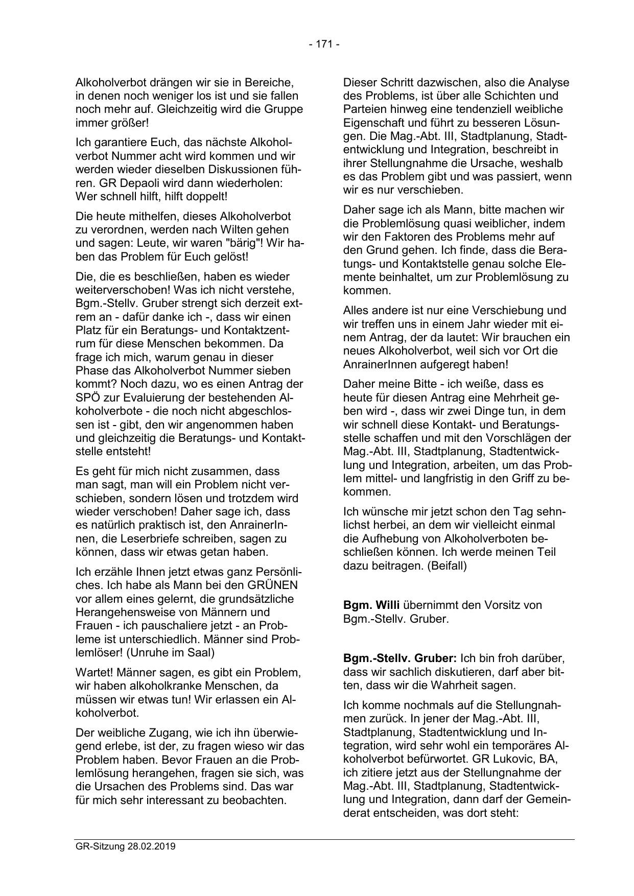 Stadtplanung, Stadtentwicklung und Integration, wird sehr wohl ein temporäres Alkoholverbot befürwortet. GR Lukovic, BA,
