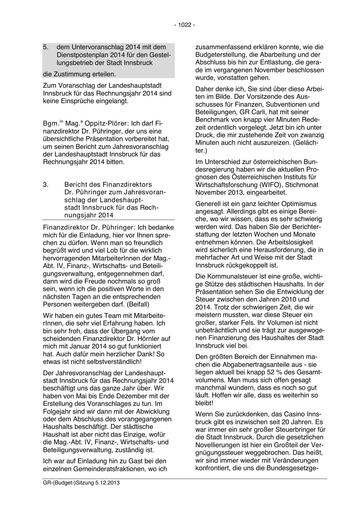 Dr. Pühringer zum Jahresvoranschlag der Landeshauptstadt Innsbruck für das Rechnungsjahr 2014