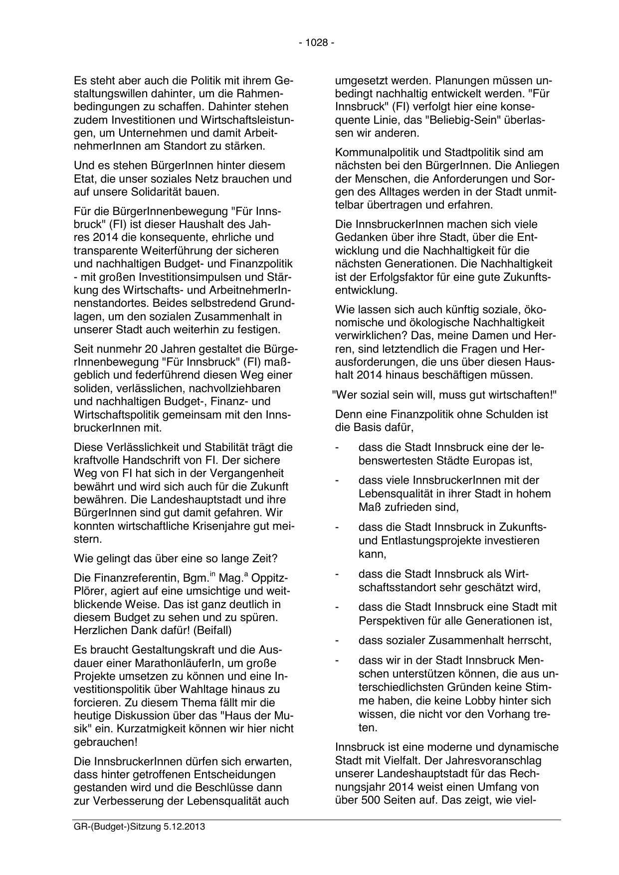 Für die BürgerInnenbewegung "Für Innsbruck" (FI) ist dieser Haushalt des Jahres 2014 die konsequente, ehrliche und