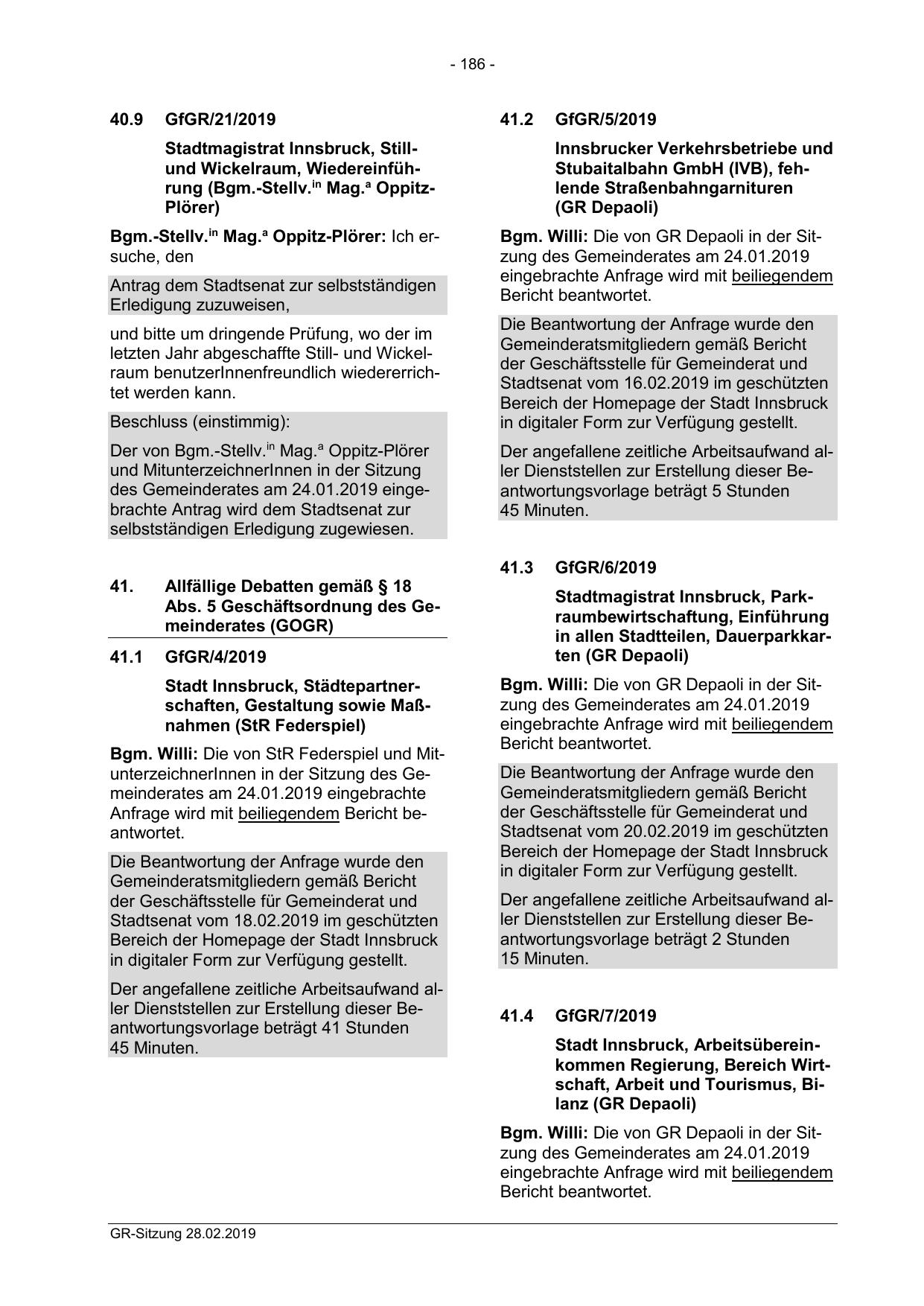 Bgm. Willi: Die von GR Depaoli in der Sitzung des Gemeinderates am 24.01.2019
