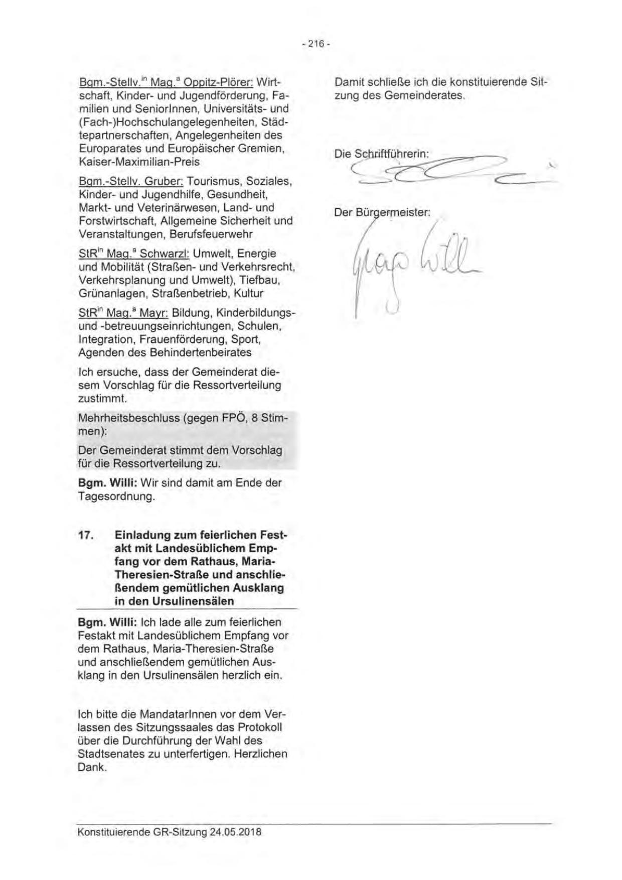Ich ersuche, dass der Gemeinderat diesem Vorschlag für die Ressortverteilung