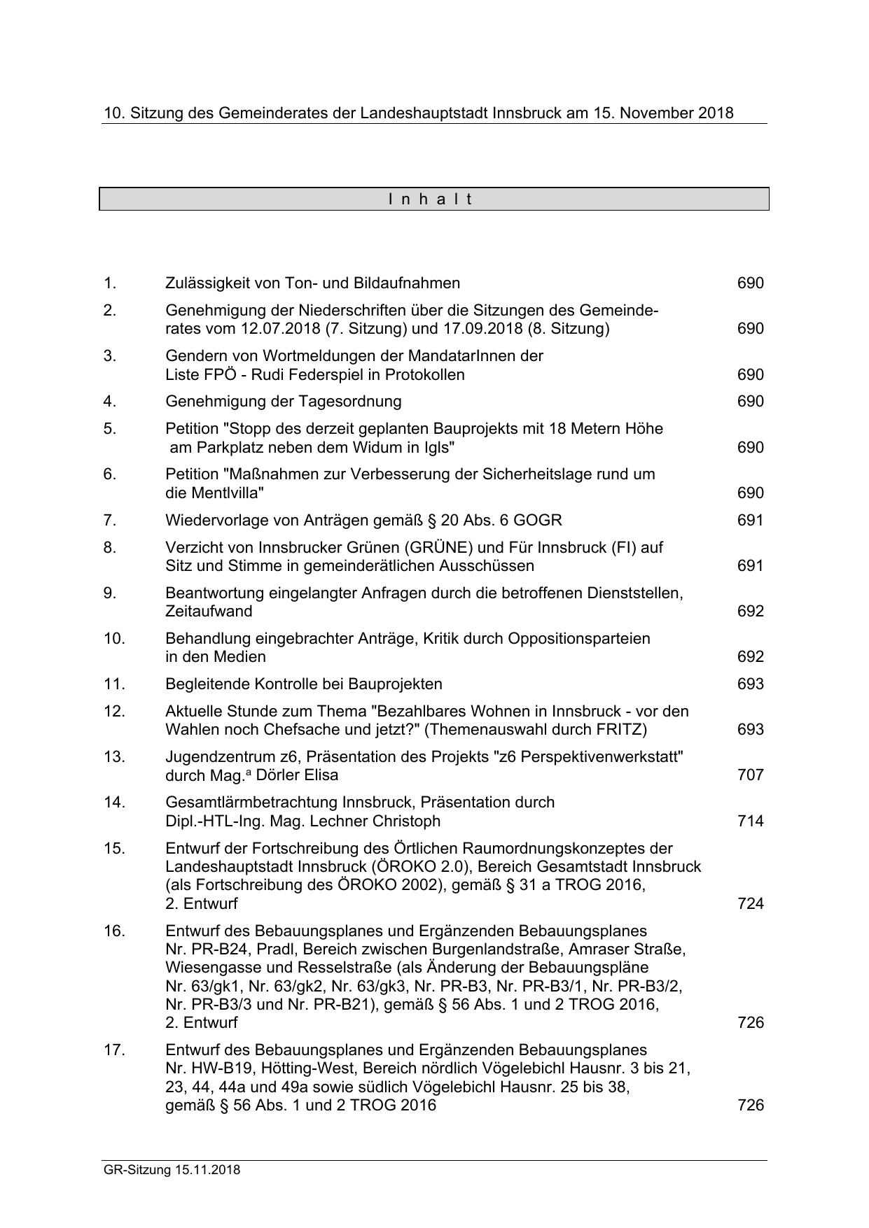 10. Sitzung des Gemeinderates der Landeshauptstadt Innsbruck am 15. November 2018