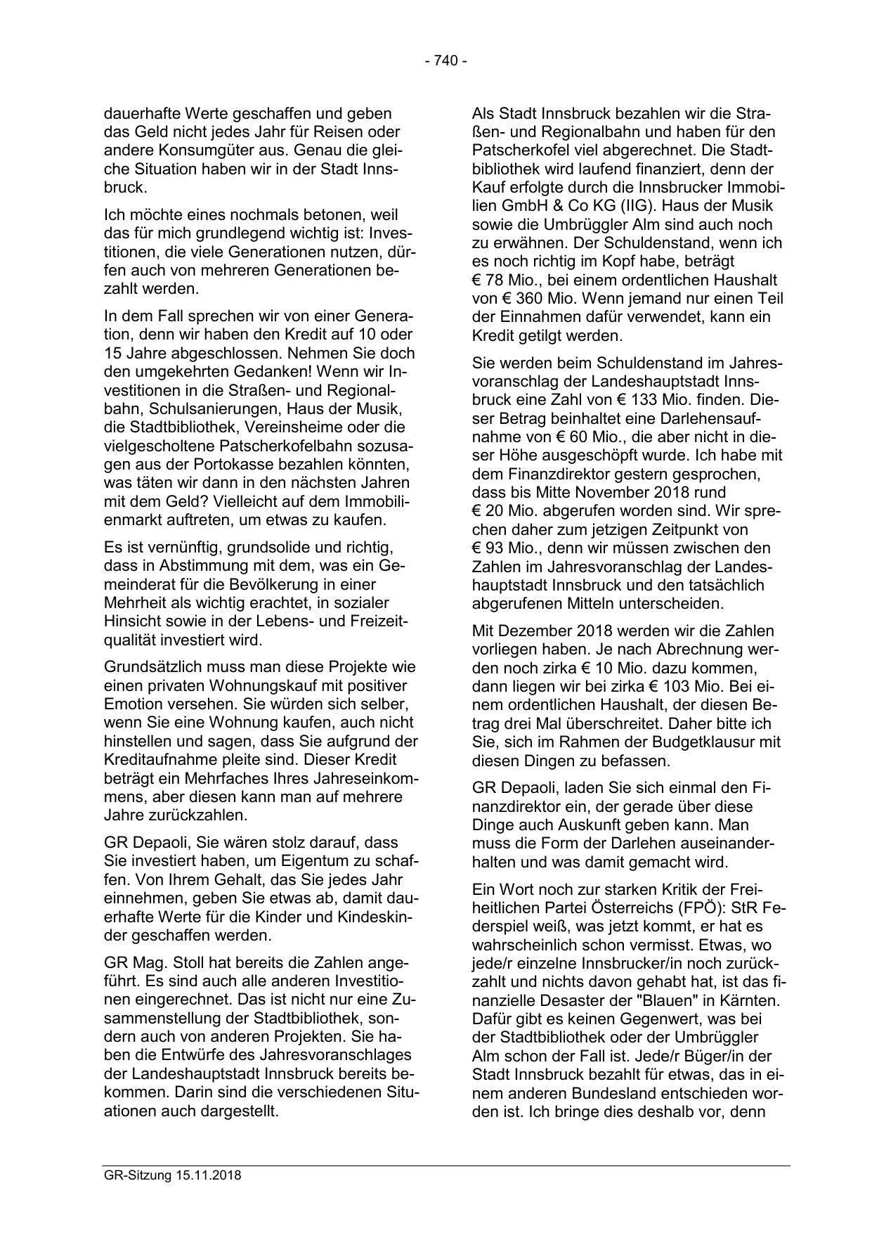 Sie werden beim Schuldenstand im Jahresvoranschlag der Landeshauptstadt Innsbruck eine Zahl von € 133 Mio. finden. Dieser Betrag beinhaltet eine Darlehensaufnahme von € 60 Mio., die aber nicht in dieser Höhe ausgeschöpft wurde. Ich habe mit