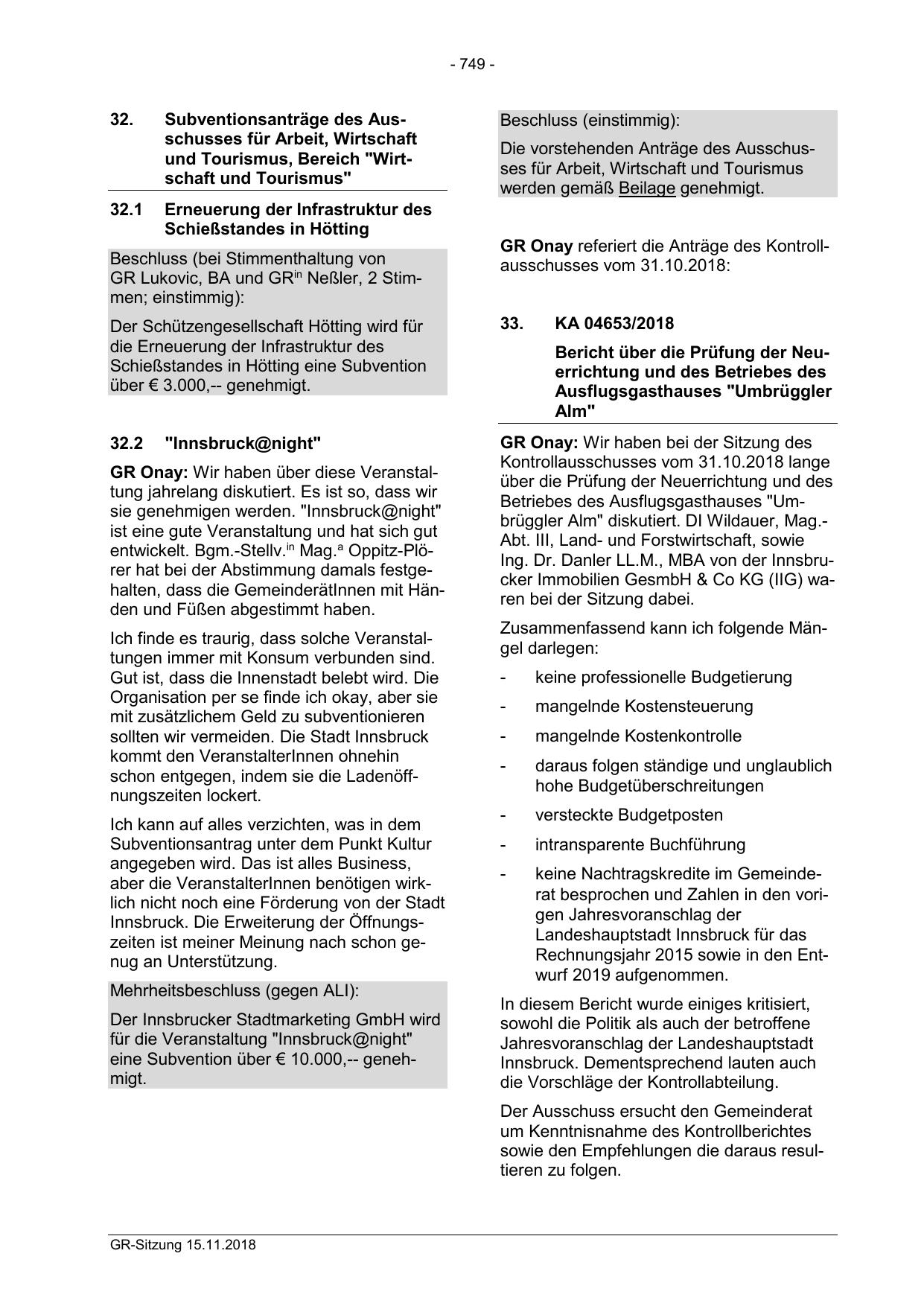 GR Onay referiert die Anträge des Kontrollausschusses vom 31.10.2018: