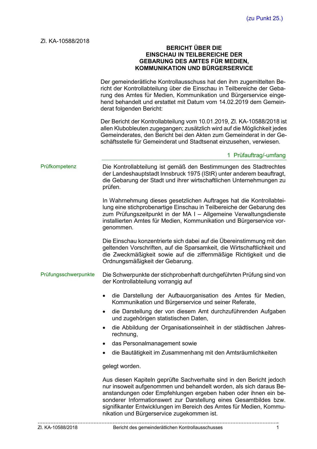 Der gemeinderätliche Kontrollausschuss hat den ihm zugemittelten Bericht der Kontrollabteilung über die Einschau in Teilbereiche der Gebarung des Amtes für Medien, Kommunikation und Bürgerservice eingehend behandelt und erstattet mit Datum vom 14.02.2019 dem Gemeinderat folgenden Bericht: