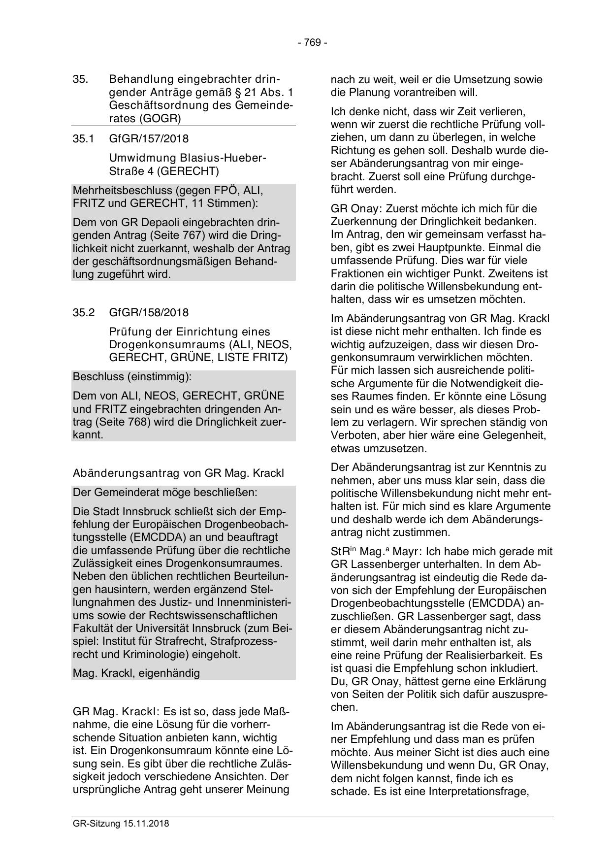 Dem von GR Depaoli eingebrachten dringenden Antrag (Seite 767) wird die Dringlichkeit nicht zuerkannt, weshalb der Antrag