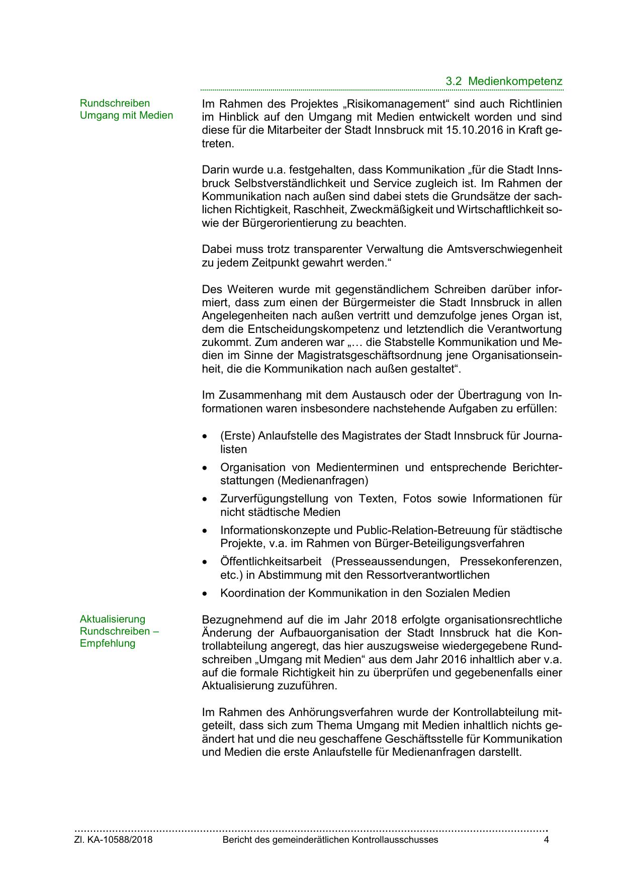Änderung der Aufbauorganisation der Stadt Innsbruck hat die Kontrollabteilung angeregt, das hier auszugsweise wiedergegebene Rundschreiben „Umgang mit Medien“ aus dem Jahr 2016 inhaltlich aber v.a.