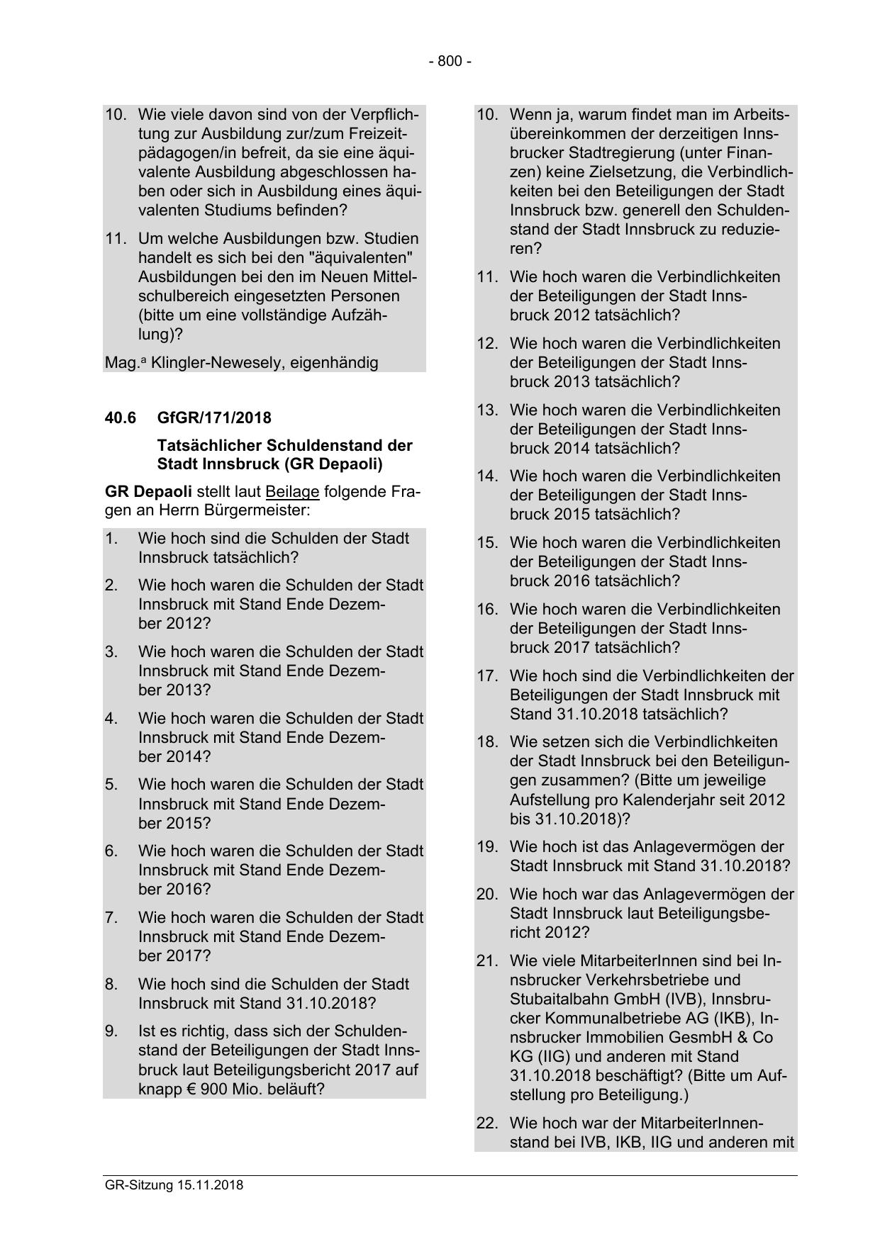 GR Depaoli stellt laut Beilage folgende Fragen an Herrn Bürgermeister: