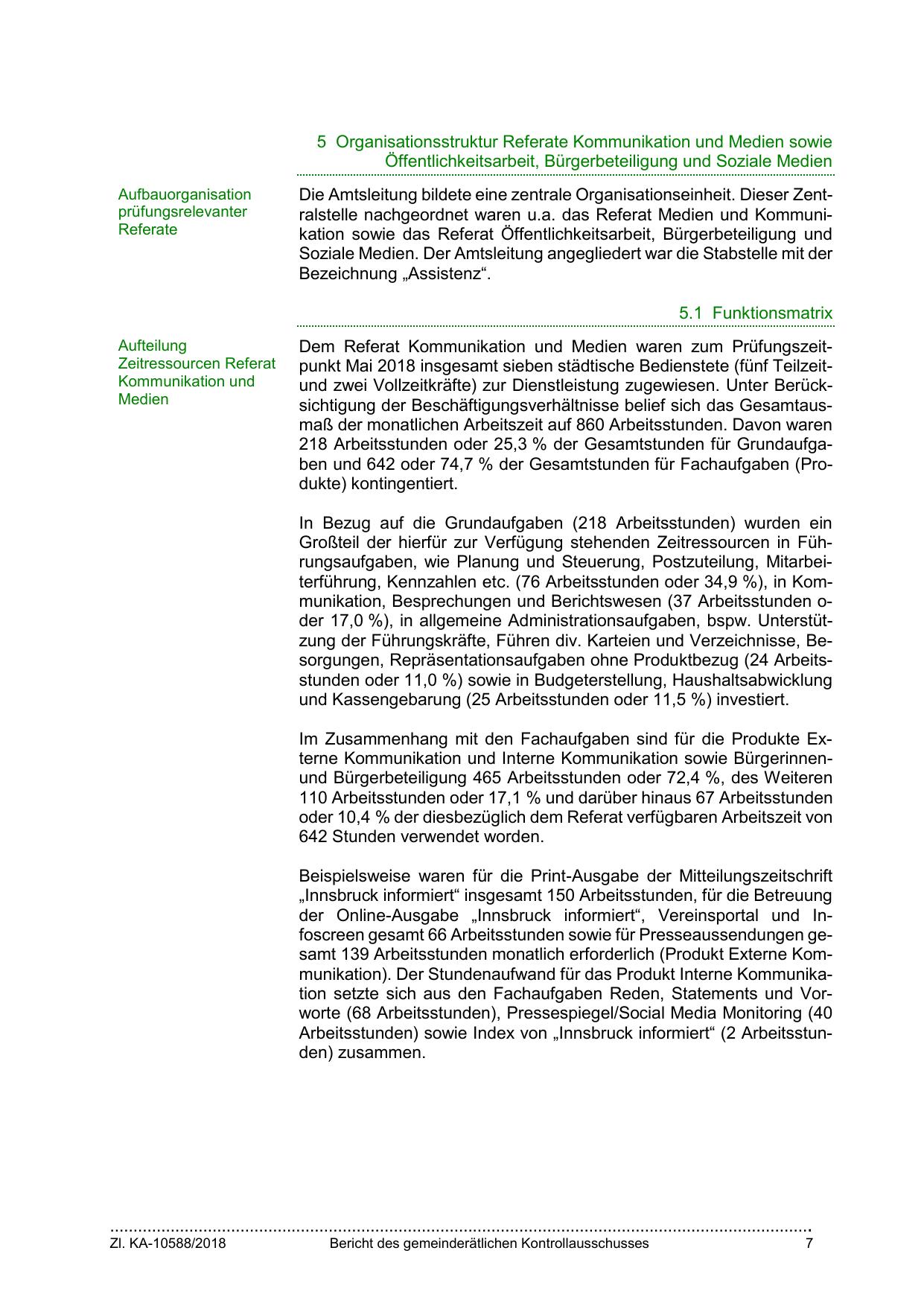 der Online-Ausgabe „Innsbruck informiert“, Vereinsportal und Infoscreen gesamt 66 Arbeitsstunden sowie für Presseaussendungen gesamt 139 Arbeitsstunden monatlich erforderlich (Produkt Externe Kommunikation). Der Stundenaufwand für das Produkt Interne Kommunikation setzte sich aus den Fachaufgaben Reden, Statements und Vorworte (68 Arbeitsstunden), Pressespiegel/Social Media Monitoring (40