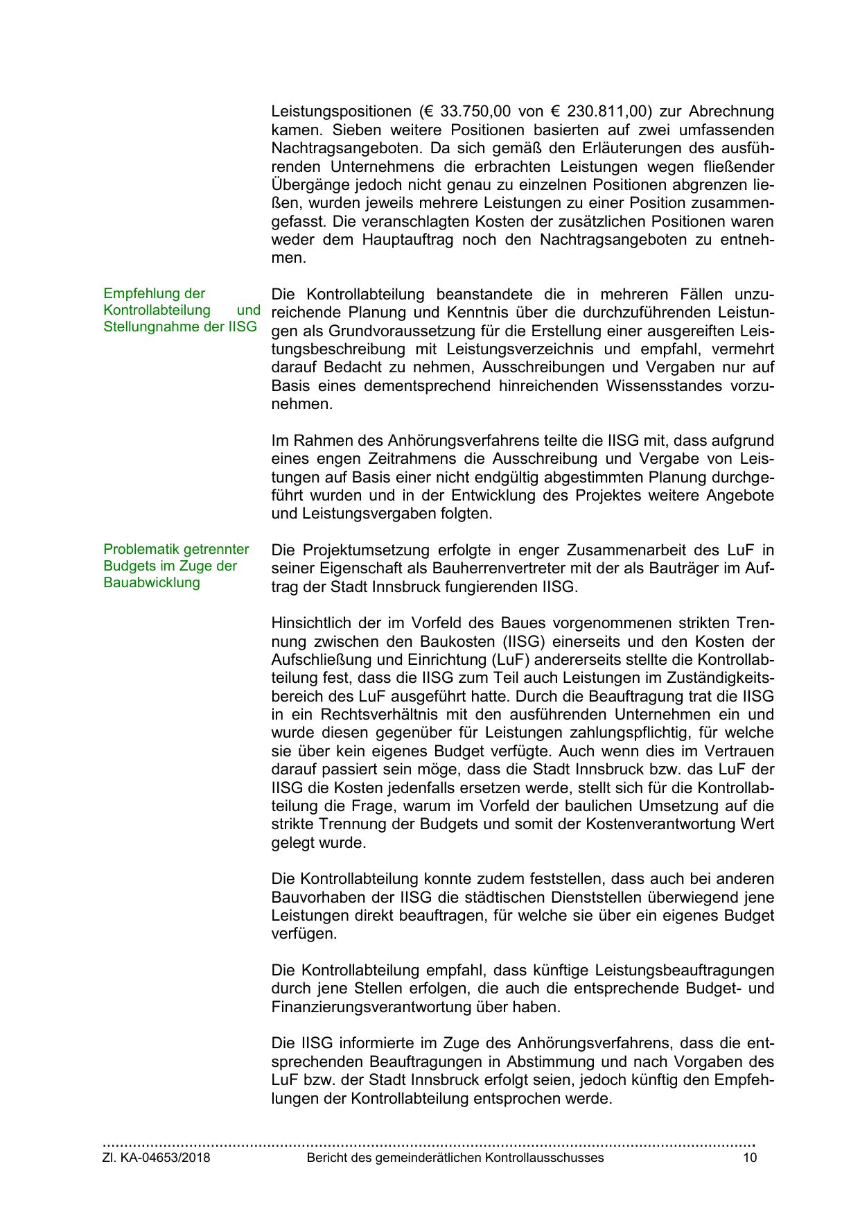 LuF bzw. der Stadt Innsbruck erfolgt seien, jedoch künftig den Empfehlungen der Kontrollabteilung entsprochen werde.