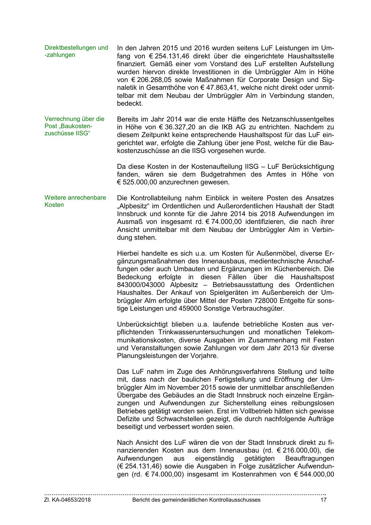 Nach Ansicht des LuF wären die von der Stadt Innsbruck direkt zu finanzierenden Kosten aus dem Innenausbau (rd. € 216.000,00), die