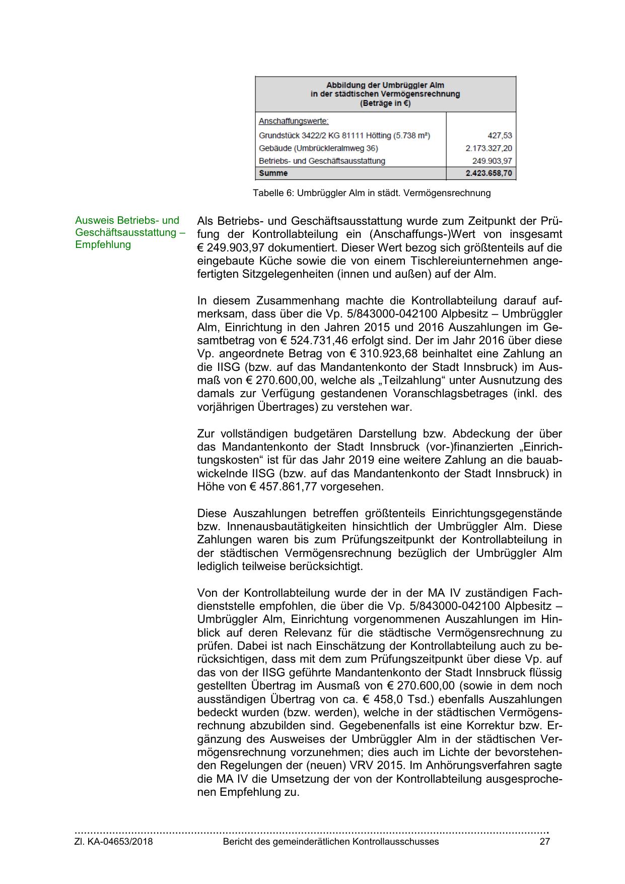 bedeckt wurden (bzw. werden), welche in der städtischen Vermögensrechnung abzubilden sind. Gegebenenfalls ist eine Korrektur bzw. Ergänzung des Ausweises der Umbrüggler Alm in der städtischen Vermögensrechnung vorzunehmen; dies auch im Lichte der bevorstehenden Regelungen der (neuen) VRV 2015. Im Anhörungsverfahren sagte
