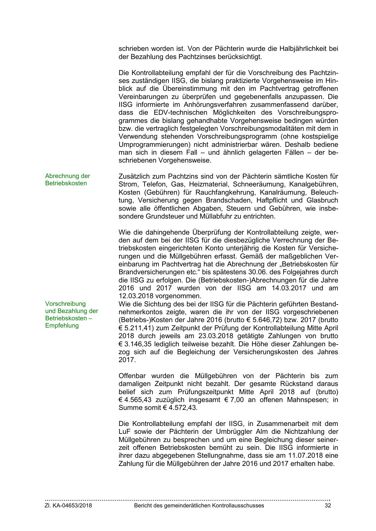 Wie die dahingehende Überprüfung der Kontrollabteilung zeigte, werden auf dem bei der IISG für die diesbezügliche Verrechnung der Betriebskosten eingerichteten Konto unterjährig die Kosten für Versicherungen und die Müllgebühren erfasst. Gemäß der maßgeblichen Vereinbarung im Pachtvertrag hat die Abrechnung der „Betriebskosten für