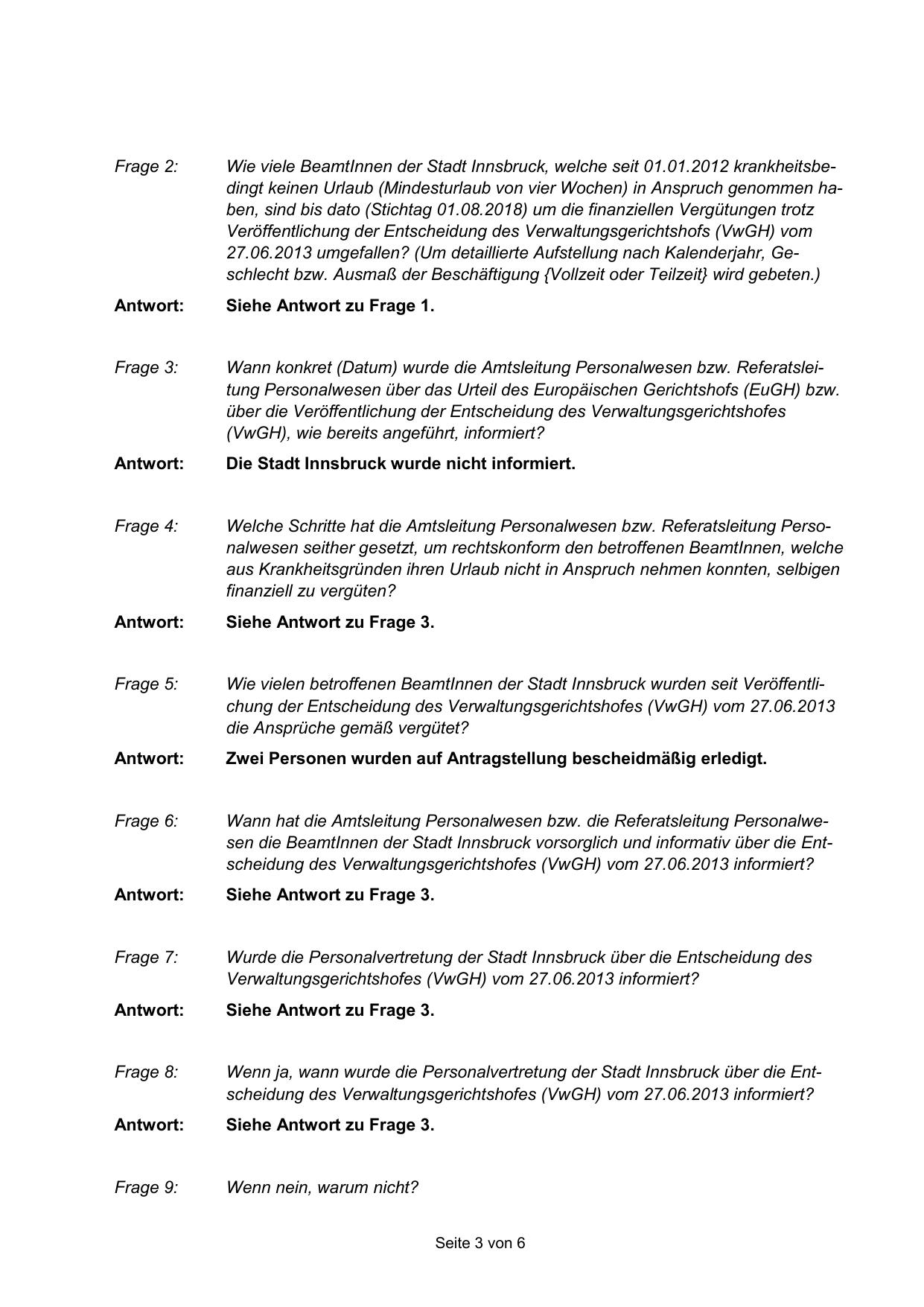 Wie viele BeamtInnen der Stadt Innsbruck, welche seit 01.01.2012 krankheitsbedingt keinen Urlaub (Mindesturlaub von vier Wochen) in Anspruch genommen haben, sind bis dato (Stichtag 01.08.2018) um die finanziellen Vergütungen trotz