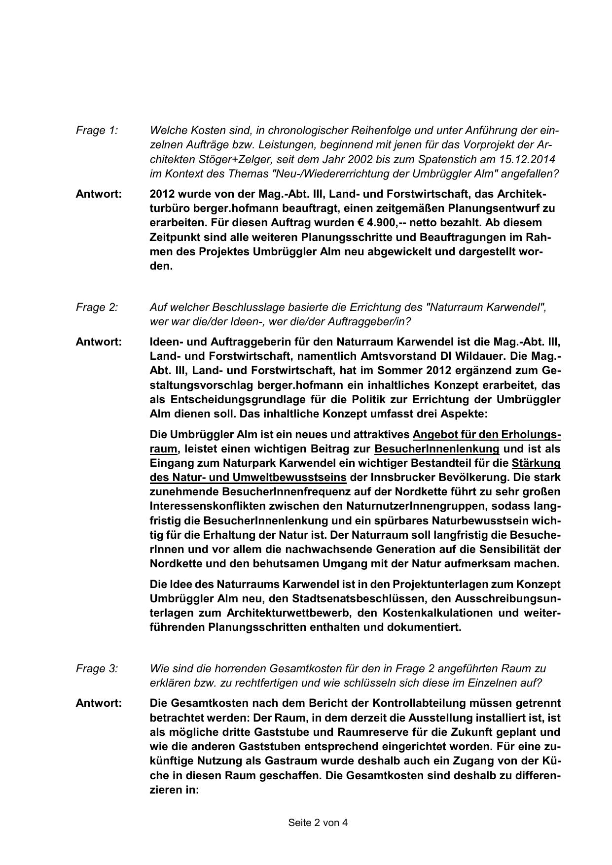 Umbrüggler Alm neu, den Stadtsenatsbeschlüssen, den Ausschreibungsunterlagen zum Architekturwettbewerb, den Kostenkalkulationen und weiterführenden Planungsschritten enthalten und dokumentiert.