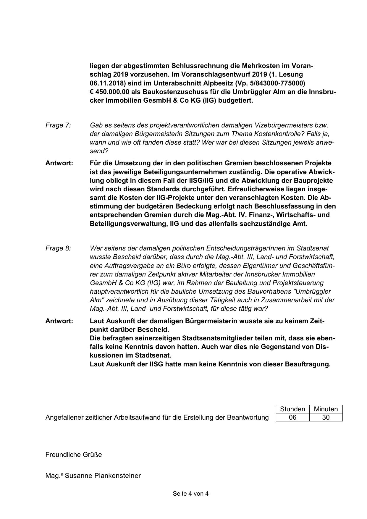 Angefallener zeitlicher Arbeitsaufwand für die Erstellung der Beantwortung
