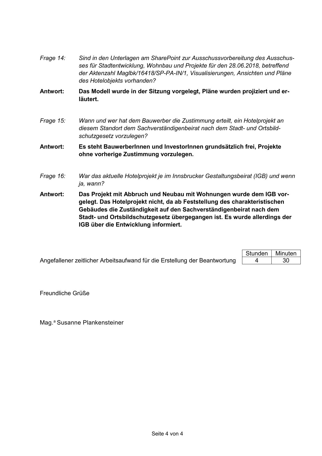 Angefallener zeitlicher Arbeitsaufwand für die Erstellung der Beantwortung