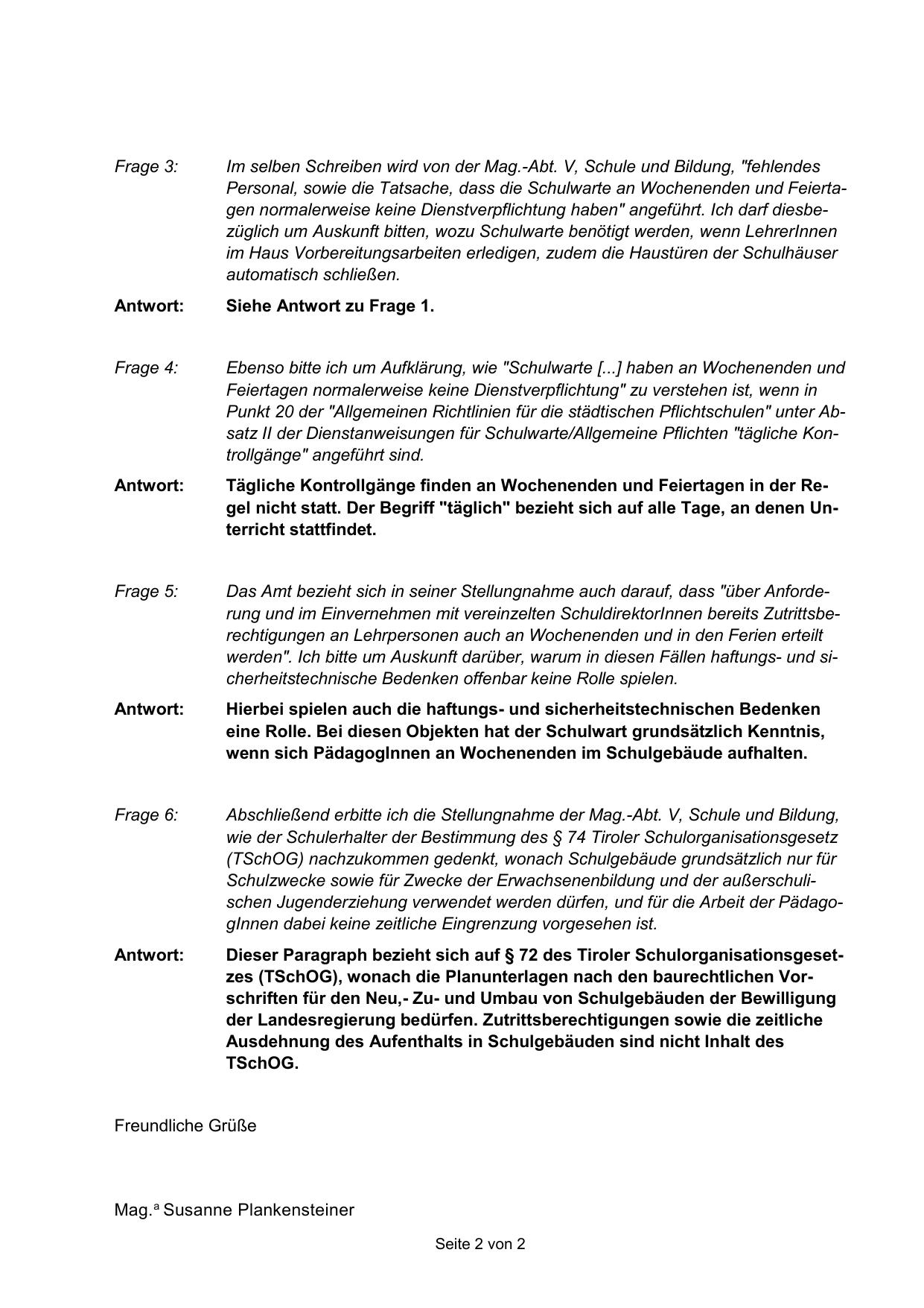 Personal, sowie die Tatsache, dass die Schulwarte an Wochenenden und Feiertagen normalerweise keine Dienstverpflichtung haben" angeführt. Ich darf diesbezüglich um Auskunft bitten, wozu Schulwarte benötigt werden, wenn LehrerInnen