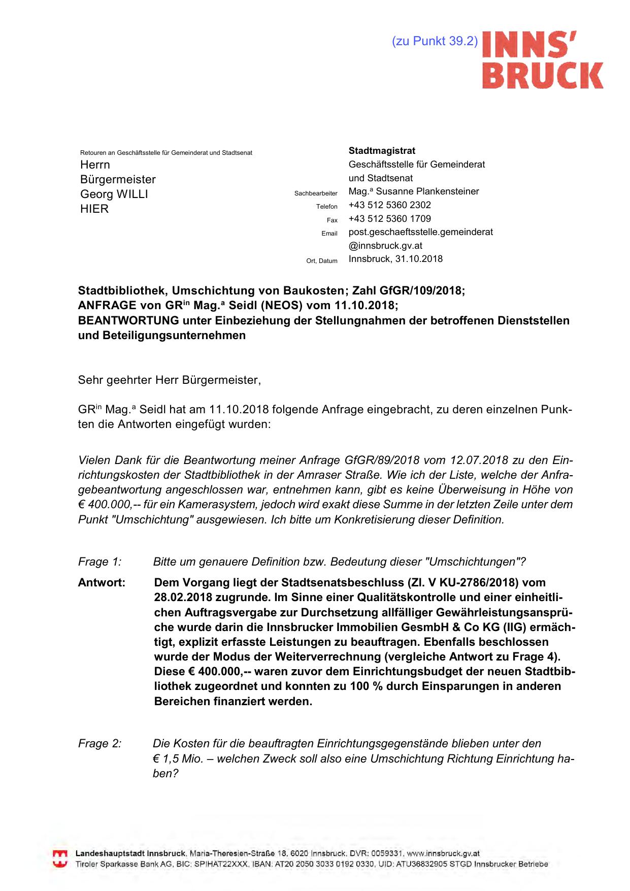 Vielen Dank für die Beantwortung meiner Anfrage GfGR/89/2018 vom 12.07.2018 zu den Einrichtungskosten der Stadtbibliothek in der Amraser Straße. Wie ich der Liste, welche der Anfragebeantwortung angeschlossen war, entnehmen kann, gibt es keine Überweisung in Höhe von
