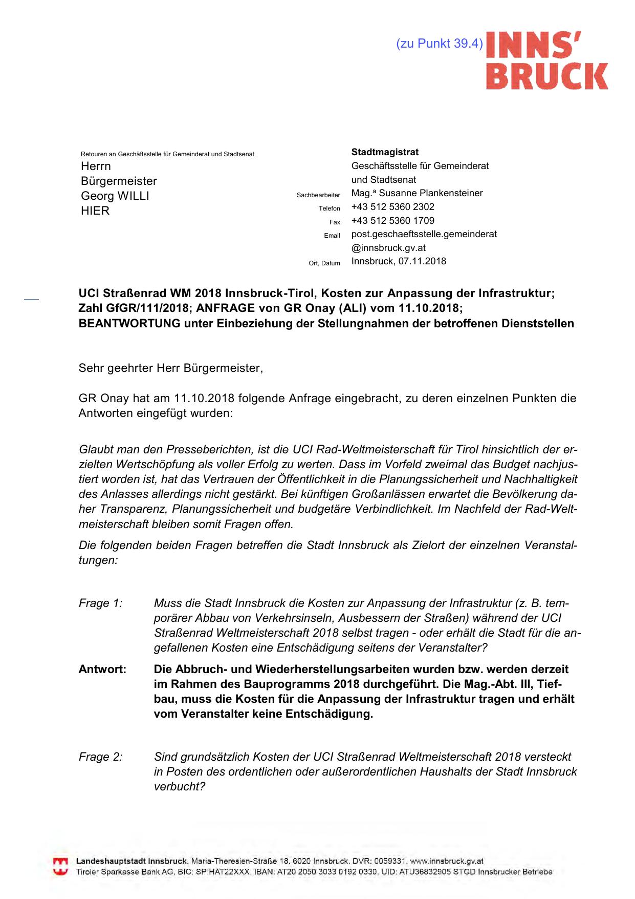 Muss die Stadt Innsbruck die Kosten zur Anpassung der Infrastruktur (z. B. temporärer Abbau von Verkehrsinseln, Ausbessern der Straßen) während der UCI