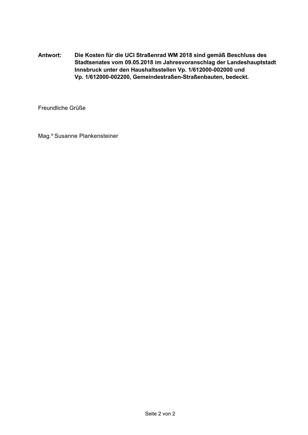 Stadtsenates vom 09.05.2018 im Jahresvoranschlag der Landeshauptstadt